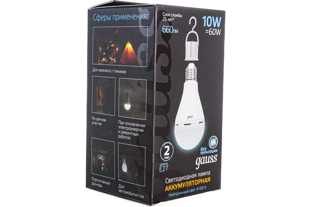Лампа Gauss LED A60 10W E27 660lm 4100K с Li-Ion аккумулятором 102402200 станет незаменимым помощником за пределами цивилизации. Лампу можно взять с собой в путешествие на машине, на пикник, кемпинг или в загородный дом.