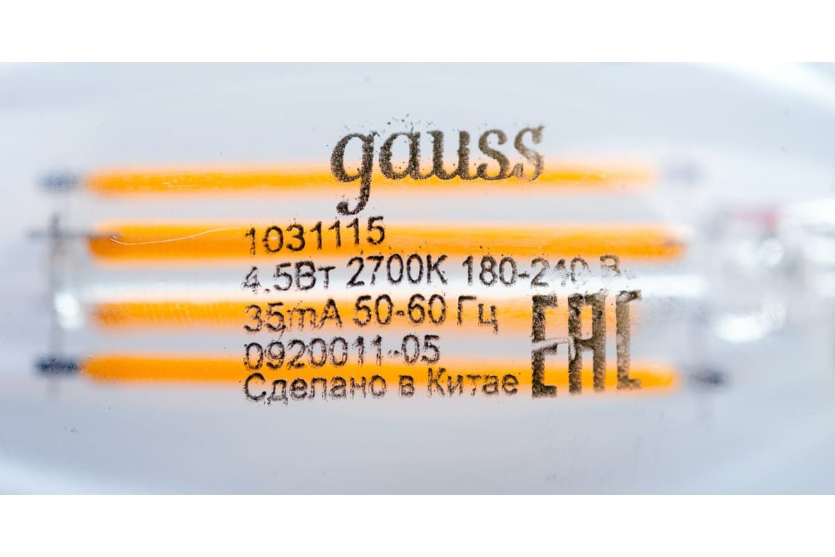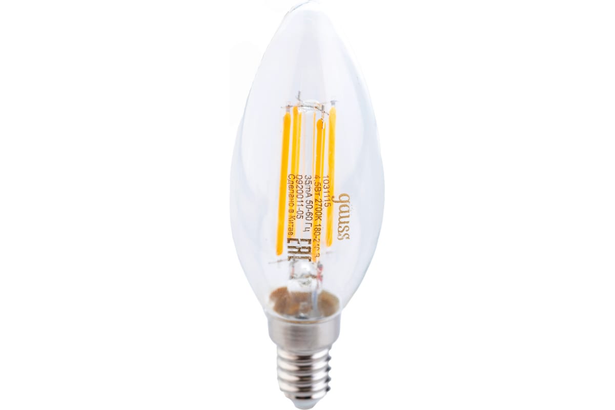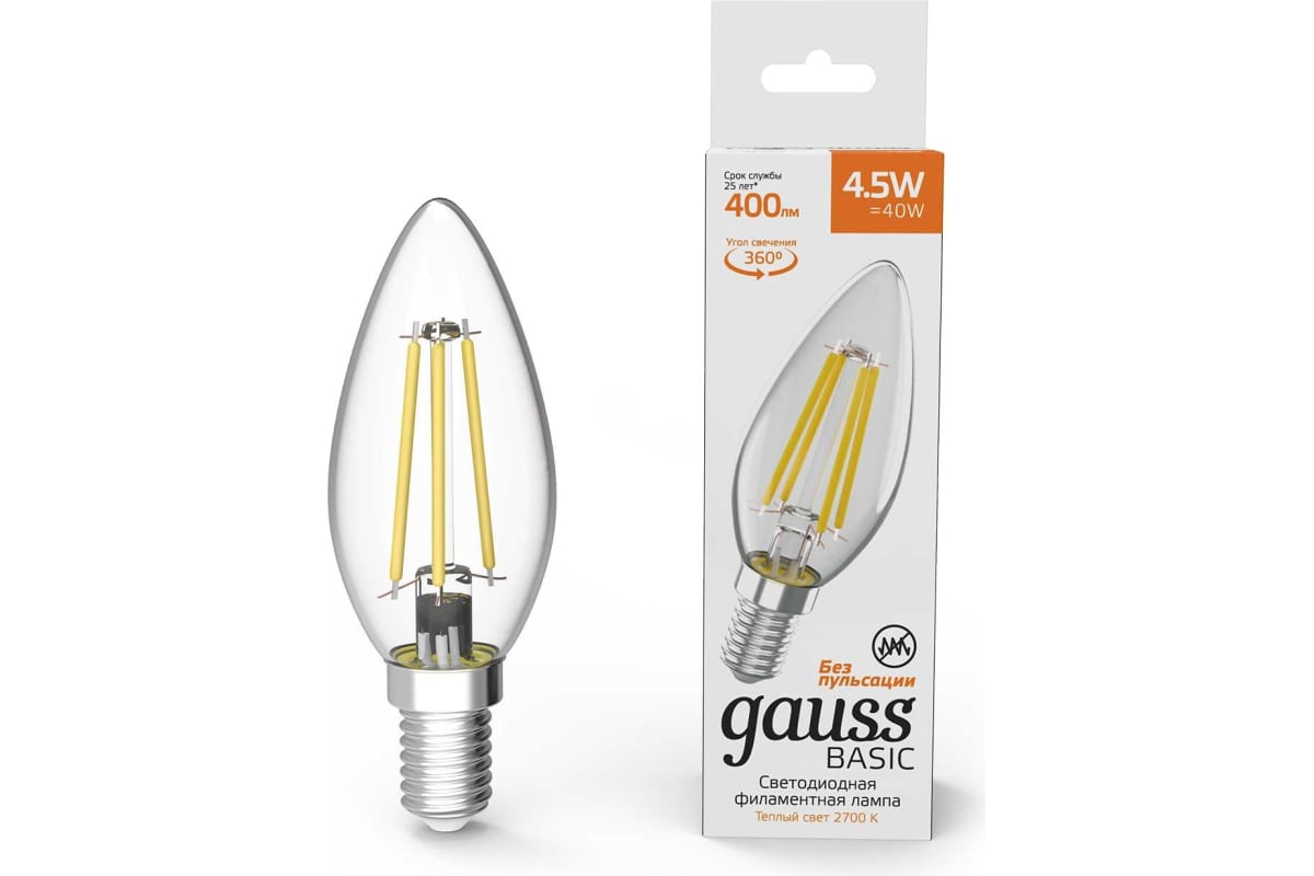 Технические характеристики Gauss Basic Filament свеча, 4,5W, 400lm, 2700К, Е14, LED 1031115