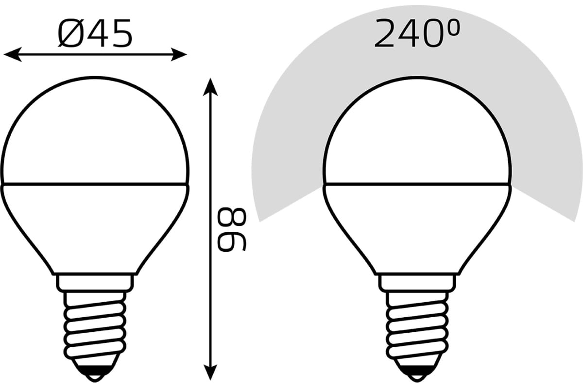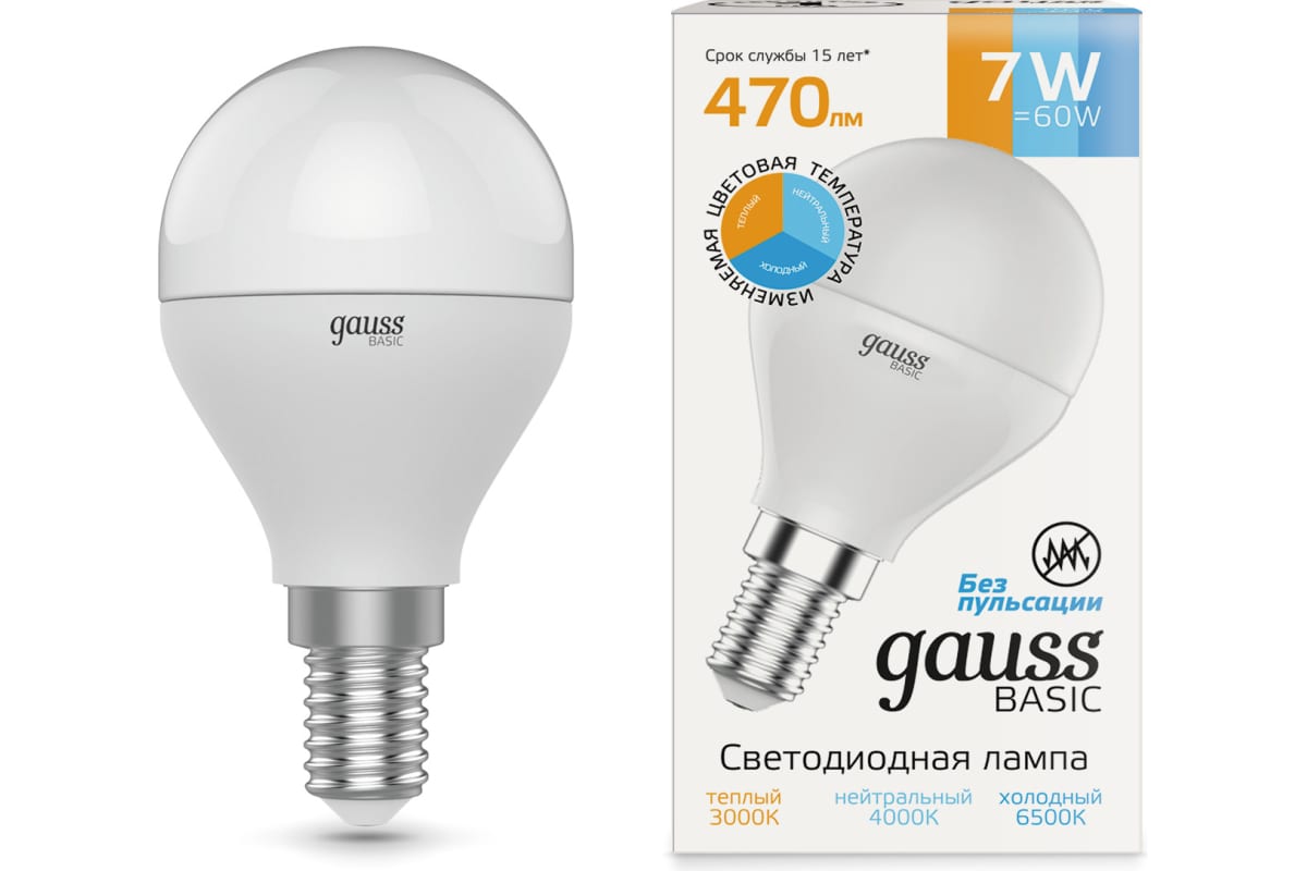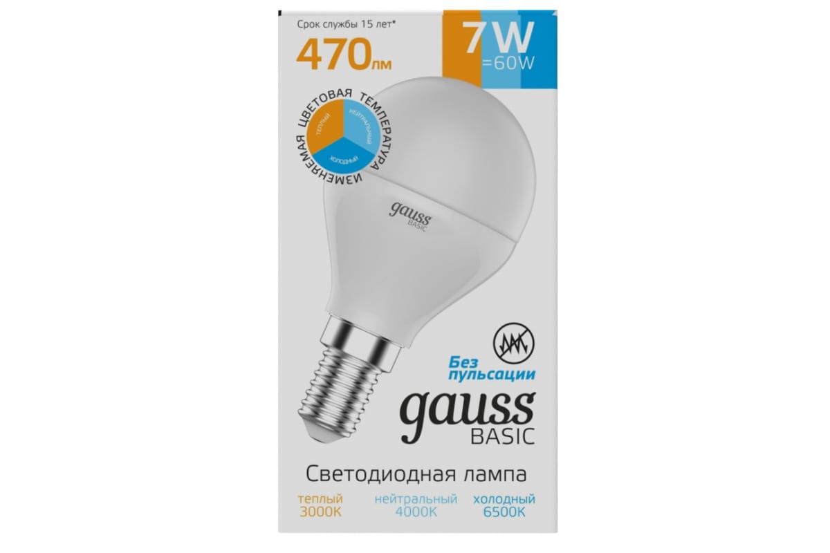 Технические характеристики Gauss BASIC Шар 7W E14 470Лм 3000K-4000K-6500K 1/10/100 1053147