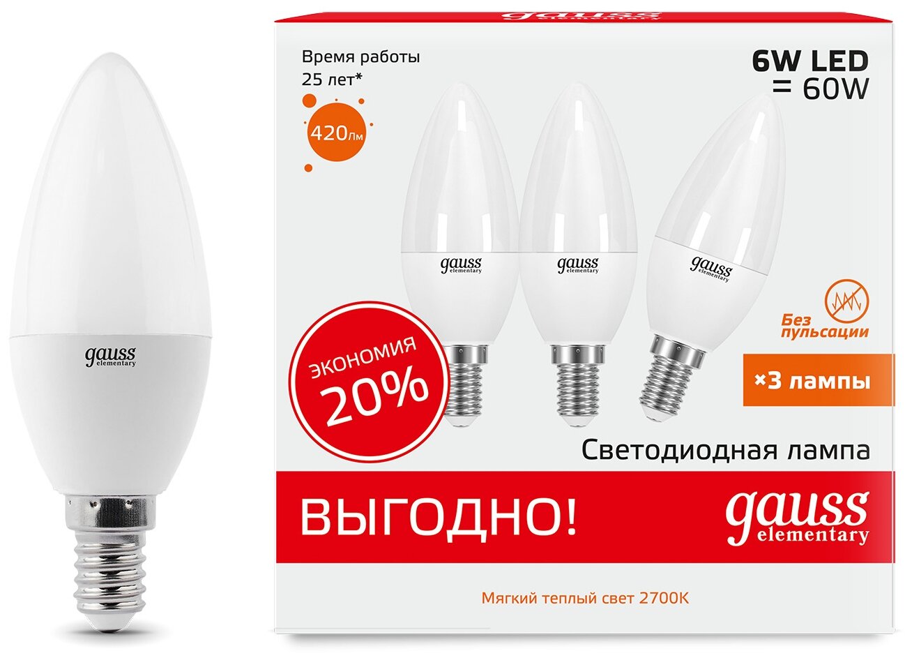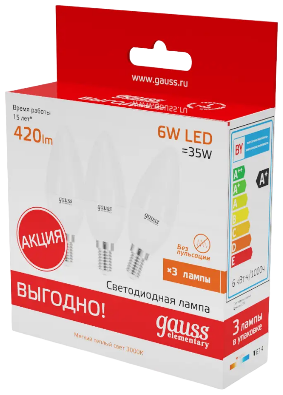 Светодиодная лампа Gauss Elementary Свеча 6W 420lm 3000K E14 (3 лампы в упаковке) LED 1/40 33116T подойдет как для домашнего, так и для коммерческого использования. Такой тип освещения прекрасно смотрится в светильниках без плафонов или устанавливается в люстры и бра. Равномерный спектр света создает зрительный комфорт в любом помещении.