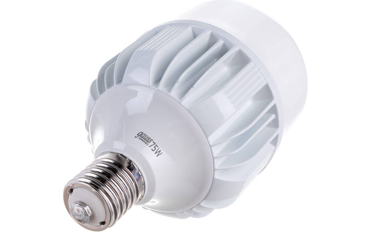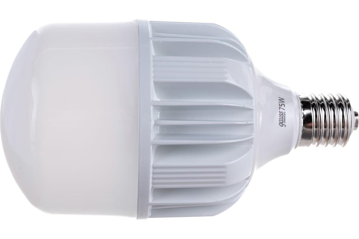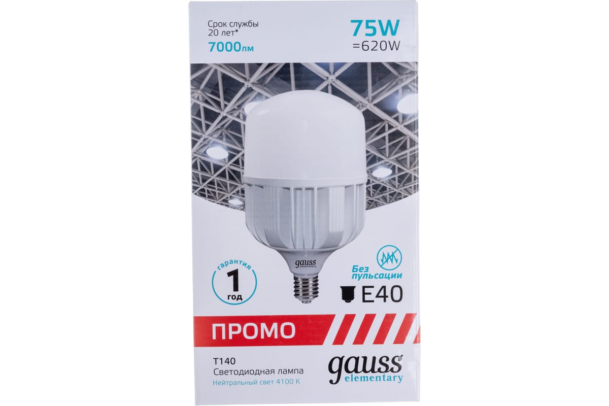 Лампа Gauss Elementary T140 75W 7000lm 4100K E40 Promo LED 1/12 60428 высокой мощности используется в основном в освещении помещений большой площади и с высокими потолками (от 3,5 метров), а также в уличных системах освещения. Высокая мощность и большой световой поток при минимальном энергопотреблении.