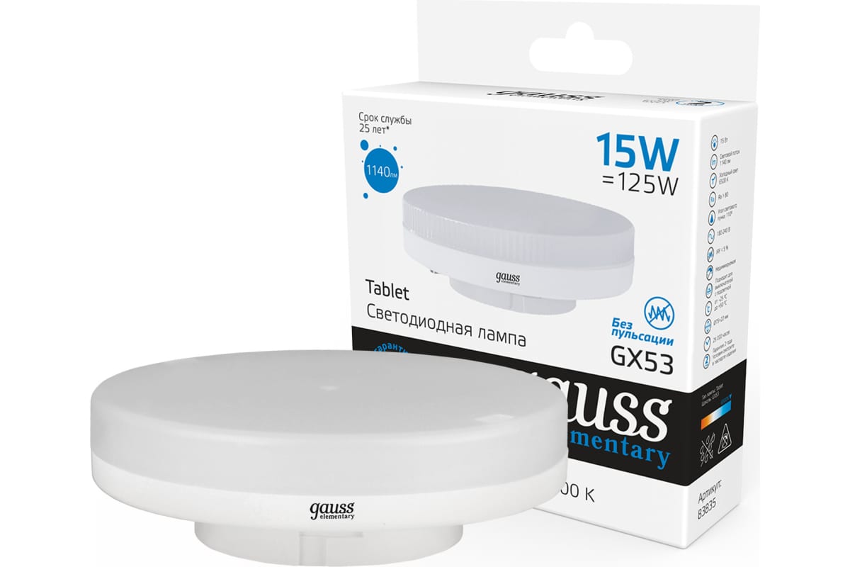 Лампа Gauss LED, Elementary, GX53, 15W, 1140lm, 6500K, 83835 - самое лучшее решение для натяжных, подвесных и реечных потолков. Лаконичный дизайн и элегантная простота отлично гармонируют с различными потолками. Малое энергопотребление, и хорошие технические характеристики.