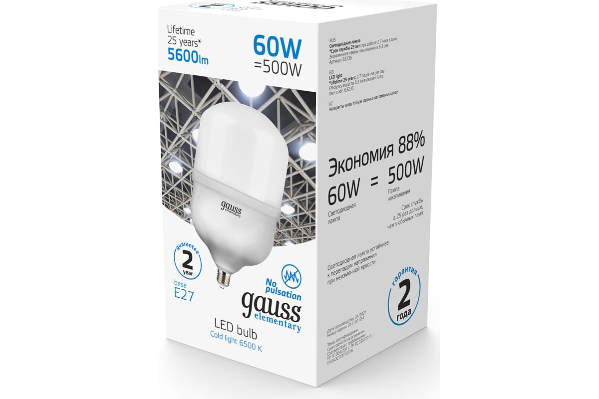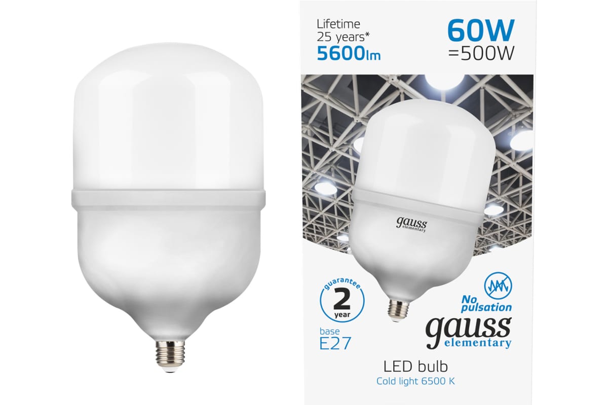Светодиодная лампа Gauss Elementary T160 60W 5600lm 6500K E27 LED 1/6 63236 высокой мощности в основном используется в освещении помещений большой площади и высокими потолками (от 3,5 метров), а также в уличных системах освещения.