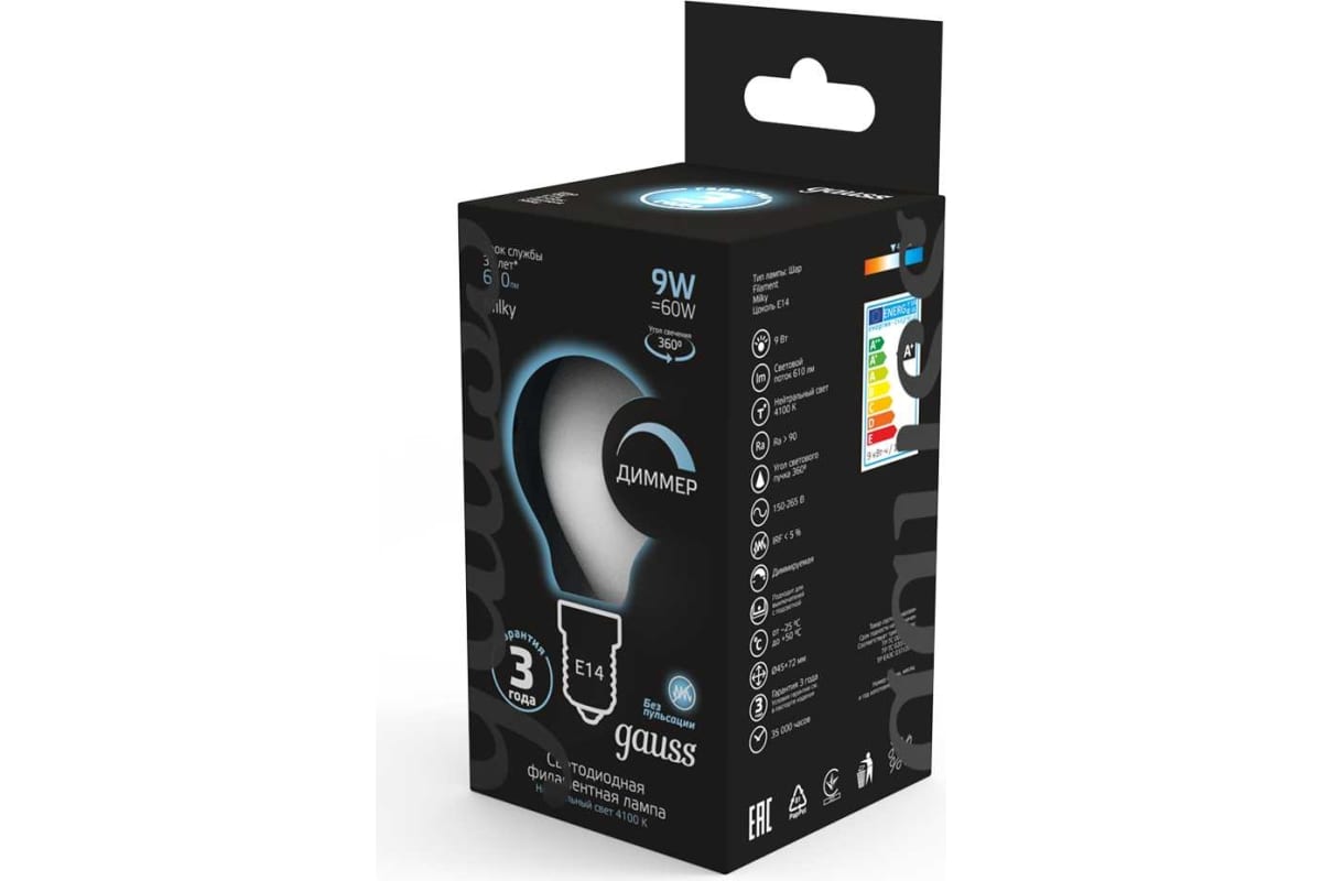 Технические характеристики Gauss Filament шар, 9W, 610lm, 4100К, Е14, milky, LED 105201209-D