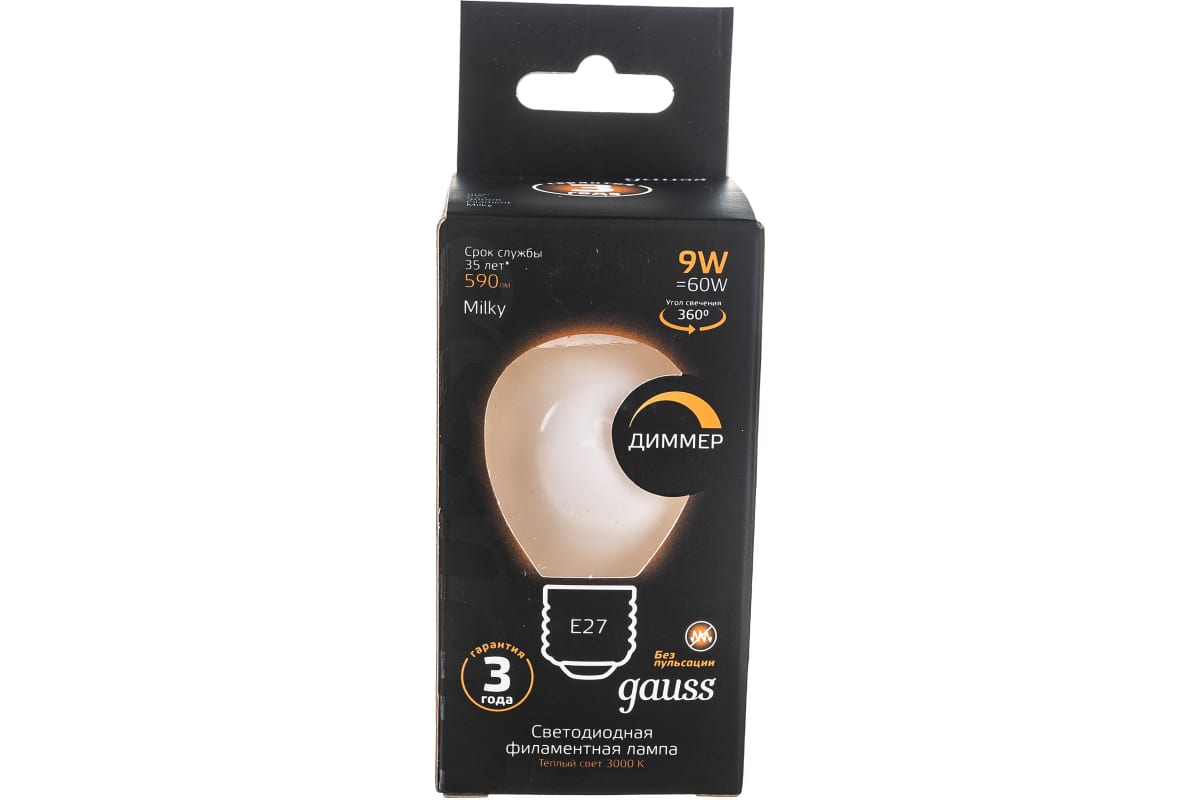 Технические характеристики Gauss Filament шар, 9W, 590lm, 3000К, Е27, milky, LED 105202109-D