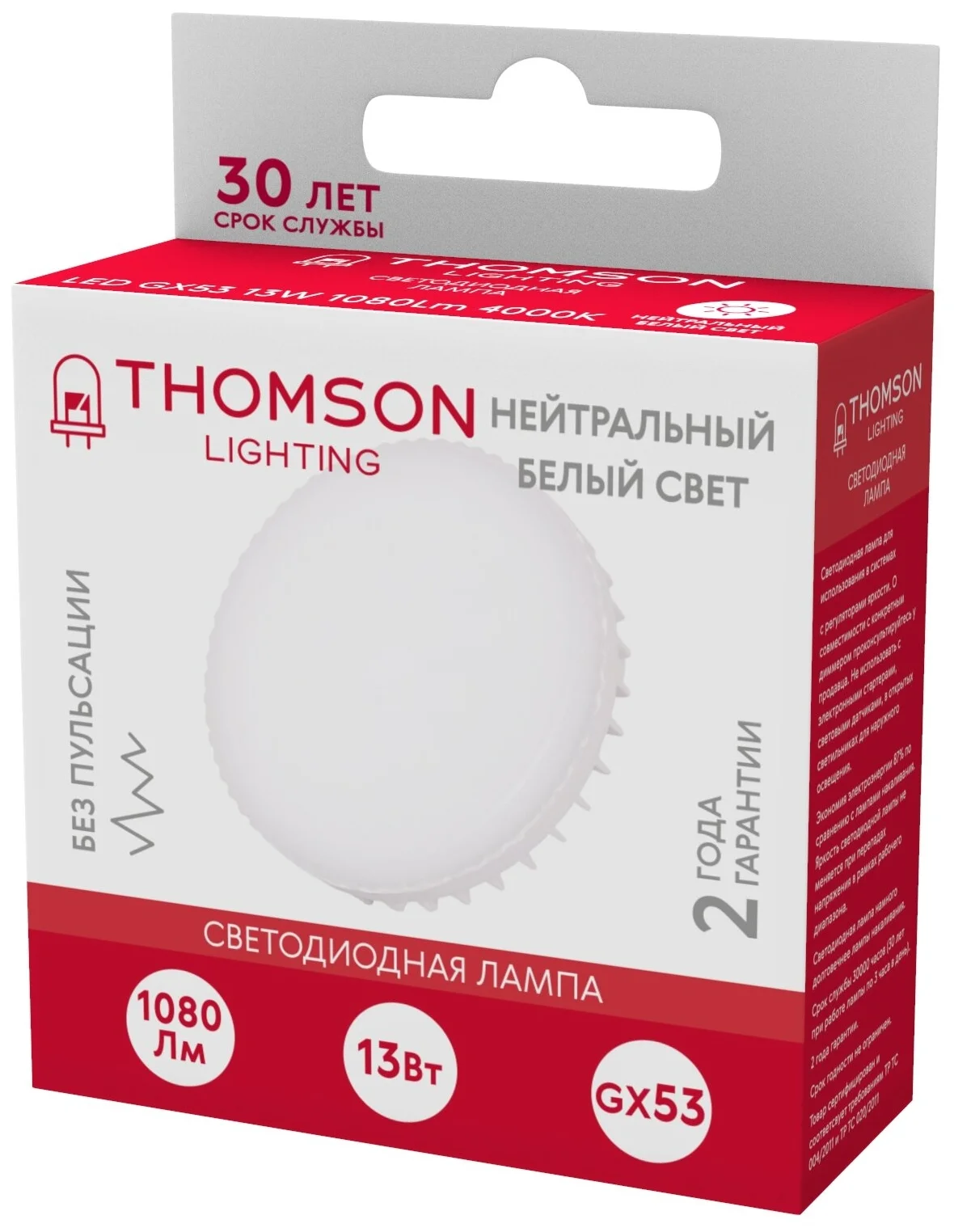 Лампа светодиодная Thomson GX53 13W 4000K таблетка матовая TH-B4013 в форме таблетки от бренда Thomson из Франции размером 26 мм. по высоте, диаметром 75 мм. с цоколем GX53 и мощностью 13 W и способна осветить помещение площадью 4,5. Изделие предназначено для использования в сети 170-265 Вольт. Цветовая температура лампы 4000K