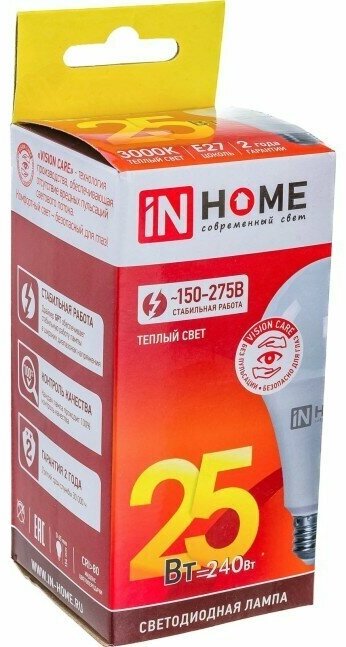 Светодиодная лампа IN HOME LED-A65-VC 25Вт 230В Е27 3000К 2380Лм 4690612024066 – современный источник света классической грушевидной формы с диаметром колбы 65 мм.