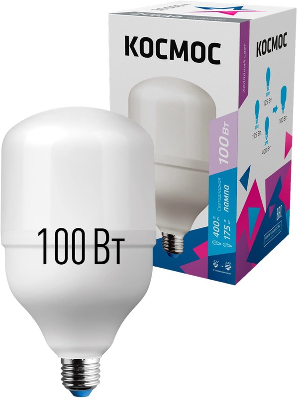 Мощная светодиодная лампа Т160 100Вт КОСМОС цоколь E27, является аналогом лампы накаливания 650Вт. Рабочая температура - 30 + 40. Работает в диапазоне напряжений 174-265V.В основе лампы используются чипы от мирового лидера Epistar, что обеспечивает надежную и стабильную работу в течение всего срока службы (50 000 часов). До 90% экономии энергии по сравнению с обычной лампой накаливания (сопоставимы по размеру); стабильный световой поток в течение всего срока службы; экологическая безопасность (не содержит ртути и тяжелых металлов); мягкое и равномерное распределение света повышает зрительный комфорт и снижает утомляемость глаз; благодаря высокому индексу цветопередачи (>80), свет лампы комфортен и передает естественные цвета и оттенки; Цвет свечения лампы - дневной белый, 6500K, идеально подойдет для зон, где необходим яркий и мягкий свет от 1 источника света. Кухня, коридор - места, где лампа поможет создать максимум яркости в компактном корпусе светильников в стиле лофт, на высоте от 6 метров. Размер лампы составляет 120мм на 205мм ми идеально сможет заменить лампу 650Вт при существенной низкой потребляемой мощности. В комплекте поставляется переходник на цоколь Е40, что делает лампу универсальной и расширяет ее применение для замены ламп ДРВ.