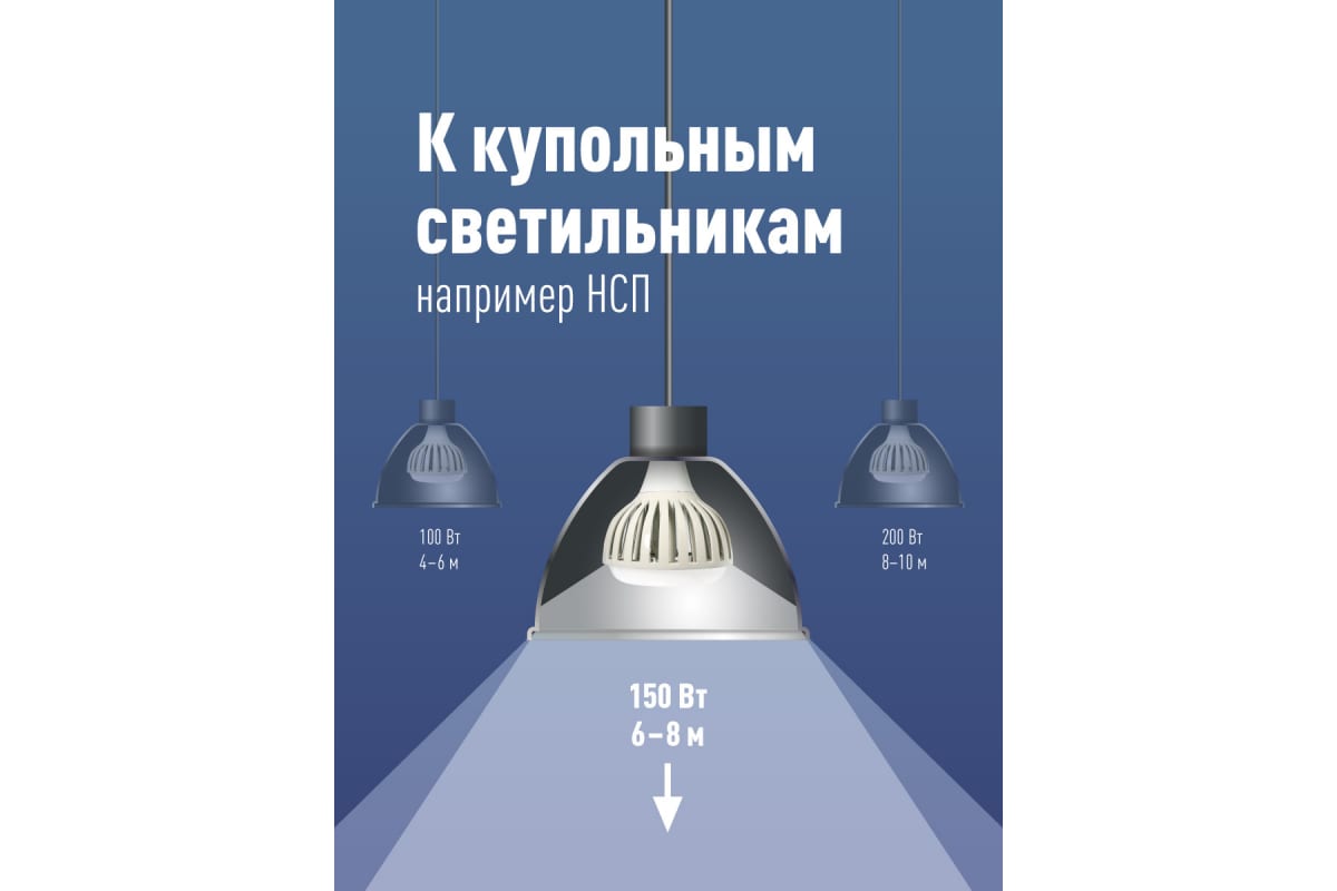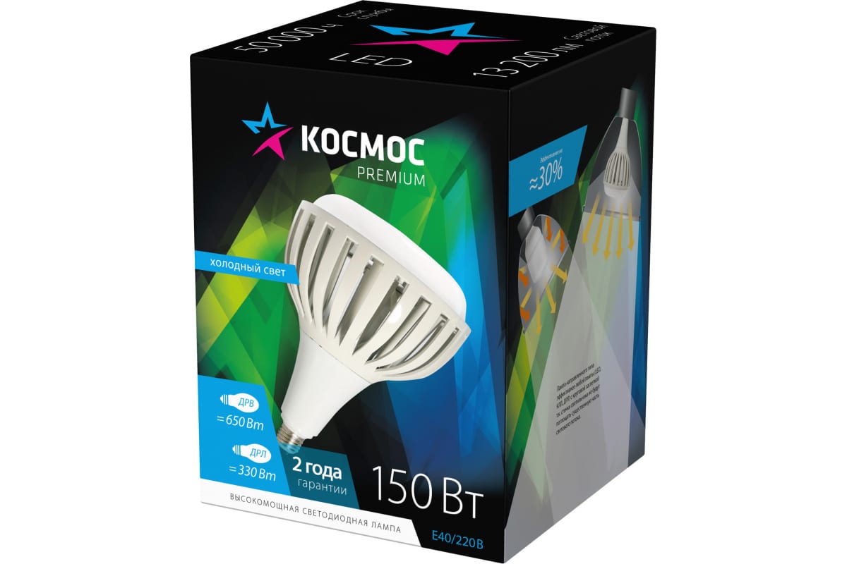 Светодиодная лампа КОСМОС PREMIUM HWLED 150W 220V E40 6500K KHWLED150WE4065 идеальна для помещений с потолками 6-11 метров: на производствах и складах, в торговых центрах и гипермаркетах. Лампа дает на 30% больше света, чем аналогичные по мощности, за счет направленного угла освещения: весь световой поток идет в полезный свет, а не поглощается светильником. Установив такую лампу, вы получаете полноценный LED-светильник, но намного дешевле, - она подходит к любым отечественным подвесным светильникам, включая НСП. Качественный свет, как у бытовых ламп. Без пульсации и с высокой передачей цветов Ra>80. Подходит для освещения оборудования с движущимися деталями, где пульсация света недопустима. Устойчива к перепадам напряжения 176-264В. Служат до 50 000 часов. Внешний металлический радиатор обеспечивает надежное охлаждение и позволяет лампе отработать полный срок без сбоев. Лампа заменяет: КЛЛ 190Вт, ДРЛ 330Вт, ДРВ 650Вт