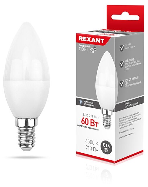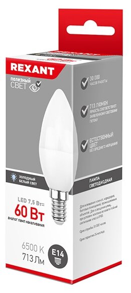 Технические характеристики REXANT Свеча, 7.5Вт, E14, 713Лм, 2700K, теплый свет 604-017