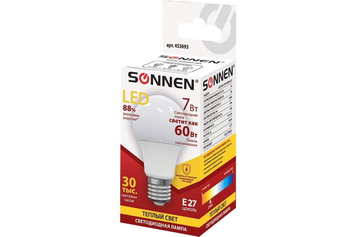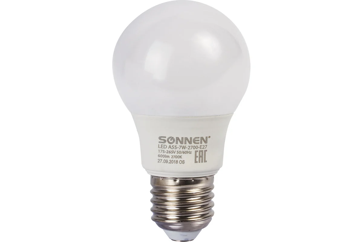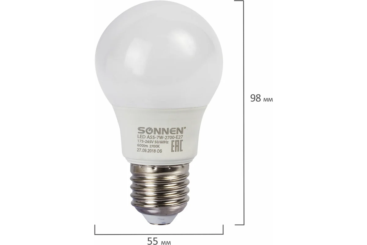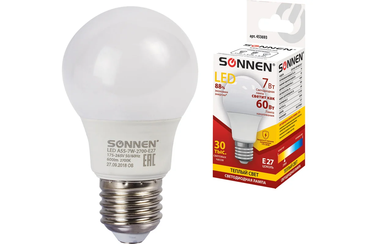 Технические характеристики SONNEN LED A55-7W-2700-E27 7 Вт, цоколь E27, грушевидная, теплый белый свет 453693