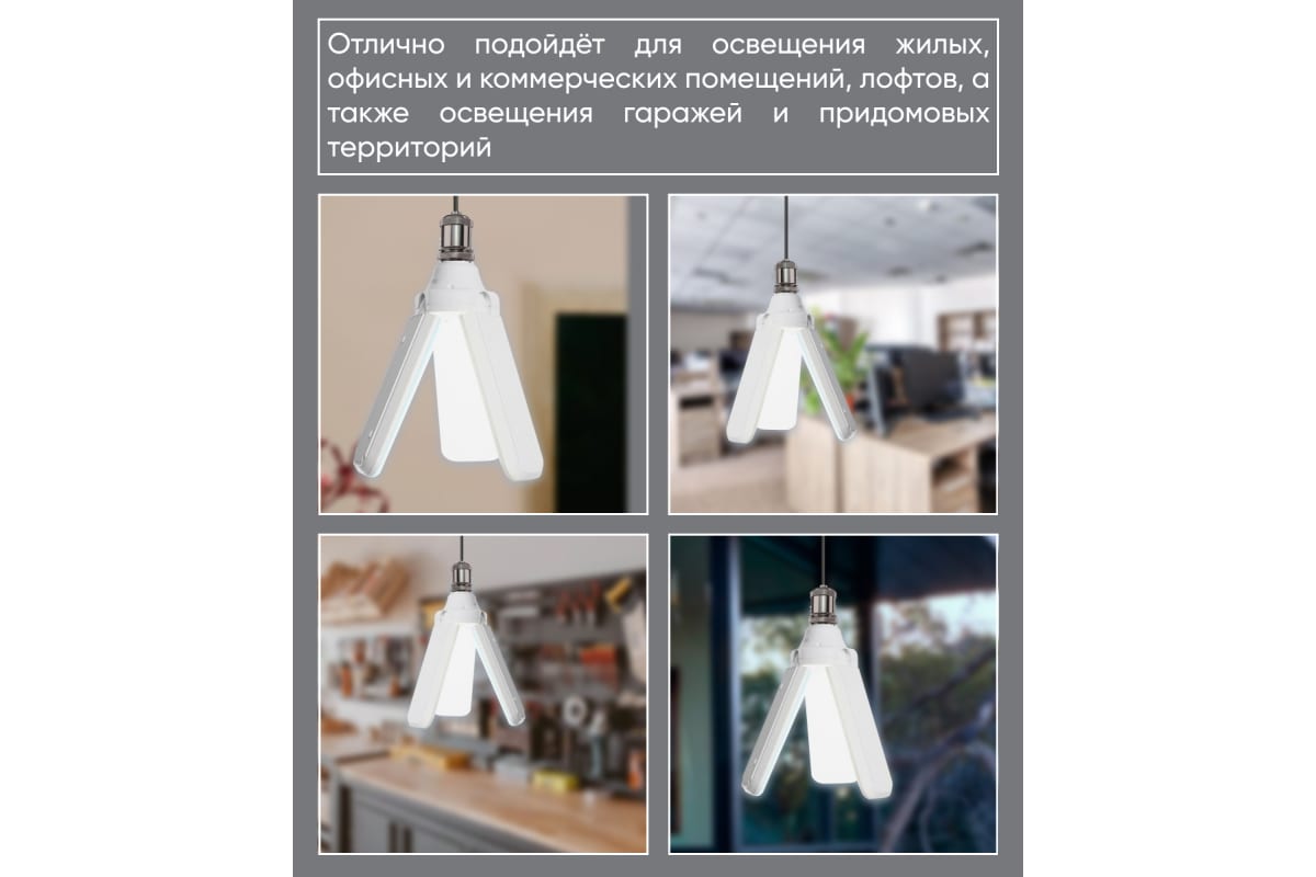 Светодиодная лампа-трансформер отлично подойдёт для освещения жилых, офисных и коммерческих помещений, лофтов, а также освещения гаражей и придомовых территорий. Лампа излучает яркий холодный белый свет, который делает пространство визуально свободнее. Легкий монтаж, отличные светотехнические характеристики, энергоэффективность и оригинальный дизайн позволят вам создать комфортную рабочую среду. Управляйте светом и формой по своему желанию, прочная конструкция светильника выдержит любую трансформацию.