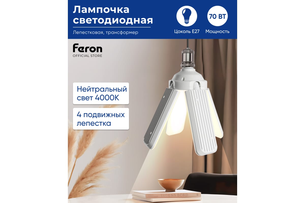 Преимущества FERON lb-654 4 лепестка e27 70w 4000к 48773