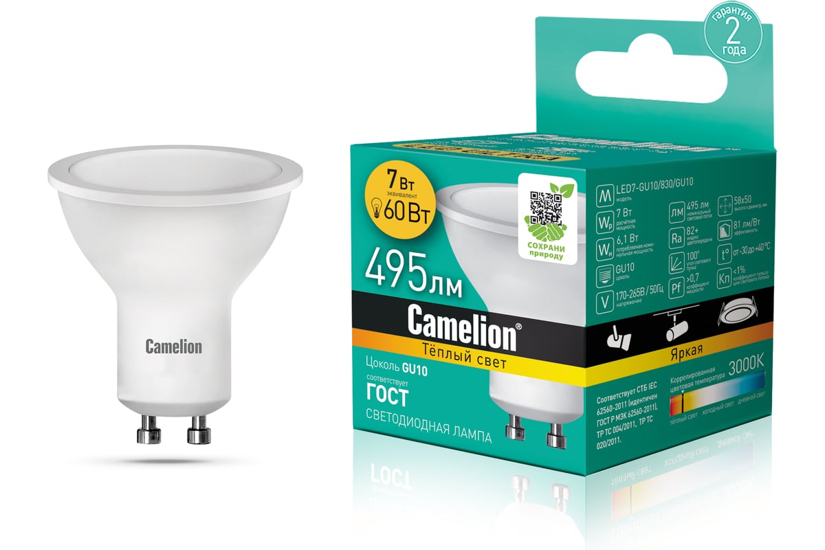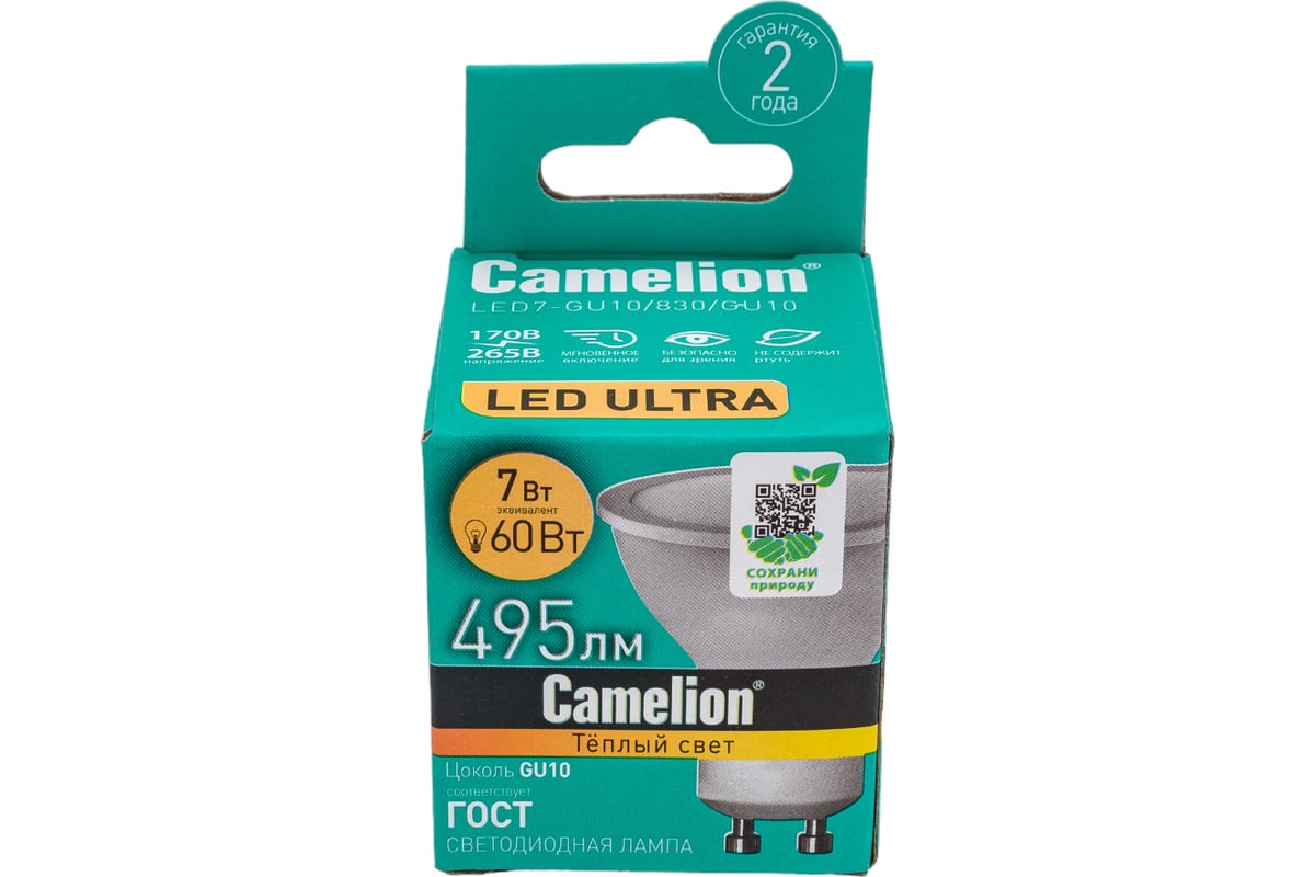 Преимущества Camelion LED7-GU10/830/GU10 7Вт 220В 12041