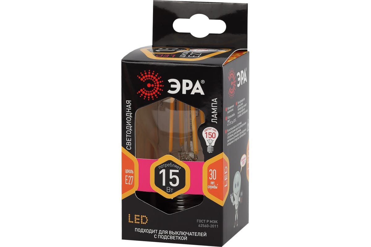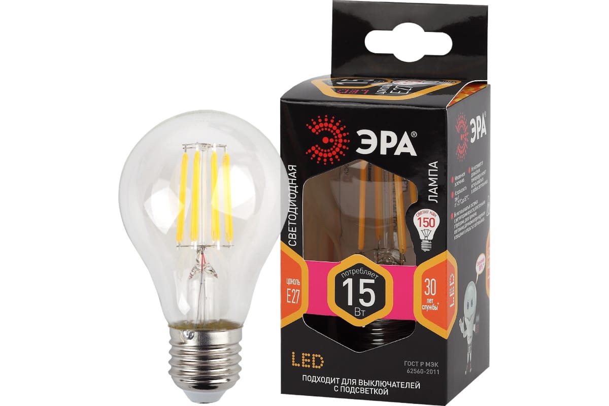 Лампа ЭРА FLED A6015W827E27, филамент, груша, 15Вт, тепл, Е27 10/100/1500 Б0046981 - лампа премиального сегмента. Максимально похожа на лампу накаливания, может использоваться в дизайнерских интерьерах. Угол рассеивания светового потока: 360 градусов. Совместима с выключателями с подсветкой.