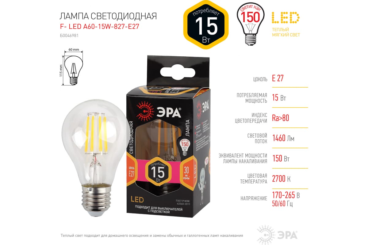 Технические характеристики ЭРА A6015W827E27 FLED груша, 15Вт, тепл, Е27 Б0046981