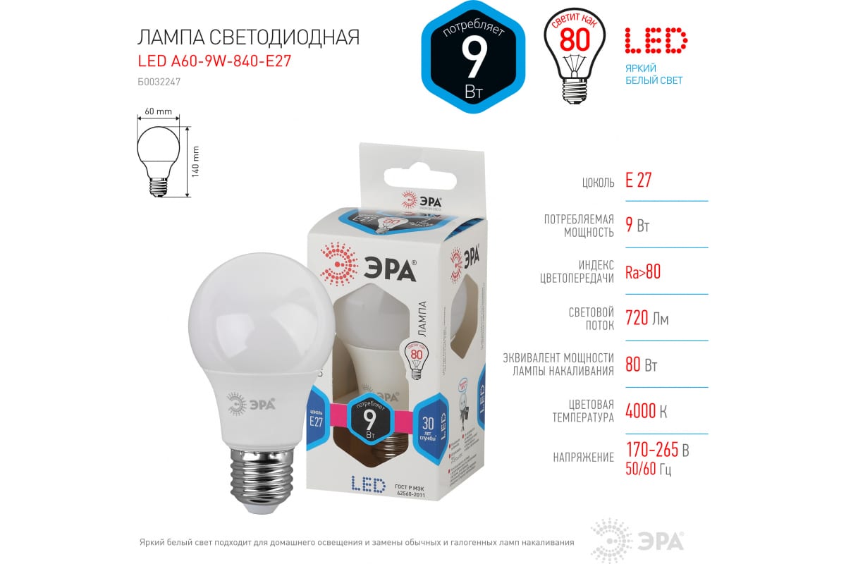 Технические характеристики ЭРА LED A60-9W-840-E27 диод, груша,нейтр Б0032247