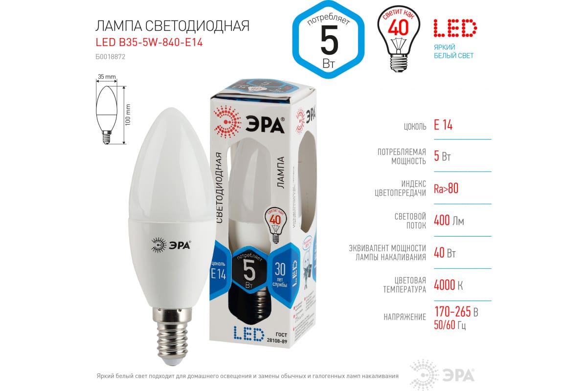 Технические характеристики ЭРА LED smd B35-5w-840-E14 Б0018872