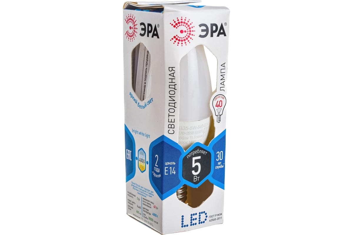 Светодиодная лампа ЭРА LED smd B35-5w-840-E14 Б0018872 - современный, качественный и доступный источник света. Позволяет экономить до 90% электроэнергии по сравнению с лампой накаливания с аналогичным световым потоком. Светит ярким белым светом, который максимально приближен к естественному дневному. Идеальна для ежедневного применения в быту. Мгновенное включение. Ровное освещение. Можно использовать как с люстрами, так и со светильниками, в том числе настольными и бра.