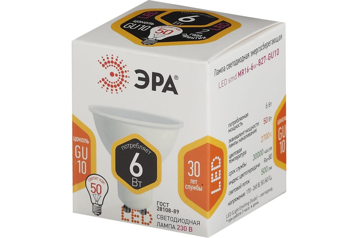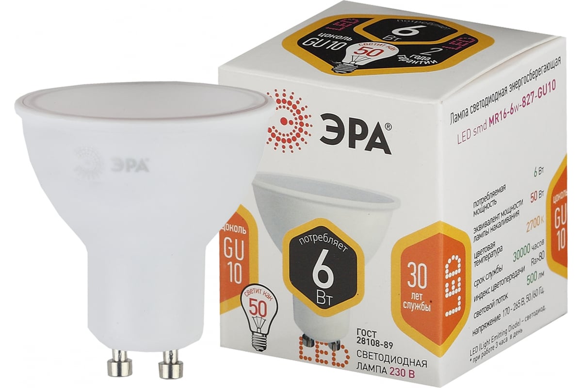 Светодиодная лампа ЭРА LED smd MR16-6w-827-GU10 Б0020543 создаёт яркое ровное освещение и экономит до 90% электроэнергии по сравнению с лампой накаливания с аналогичным световым потоком. Светит теплым светом с жёлтым оттенком - такая цветовая температура эффективна для отдыха и уютной атмосферы в доме. Используется в потолочных, настенных, настольных светильниках, в люстрах и бра. Мгновенно включается и не нагревается.