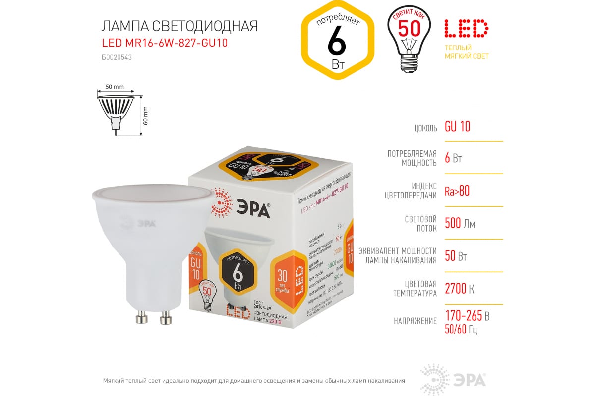 Технические характеристики ЭРА LED smd MR16-6w-827-GU10 Б0020543