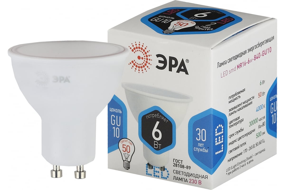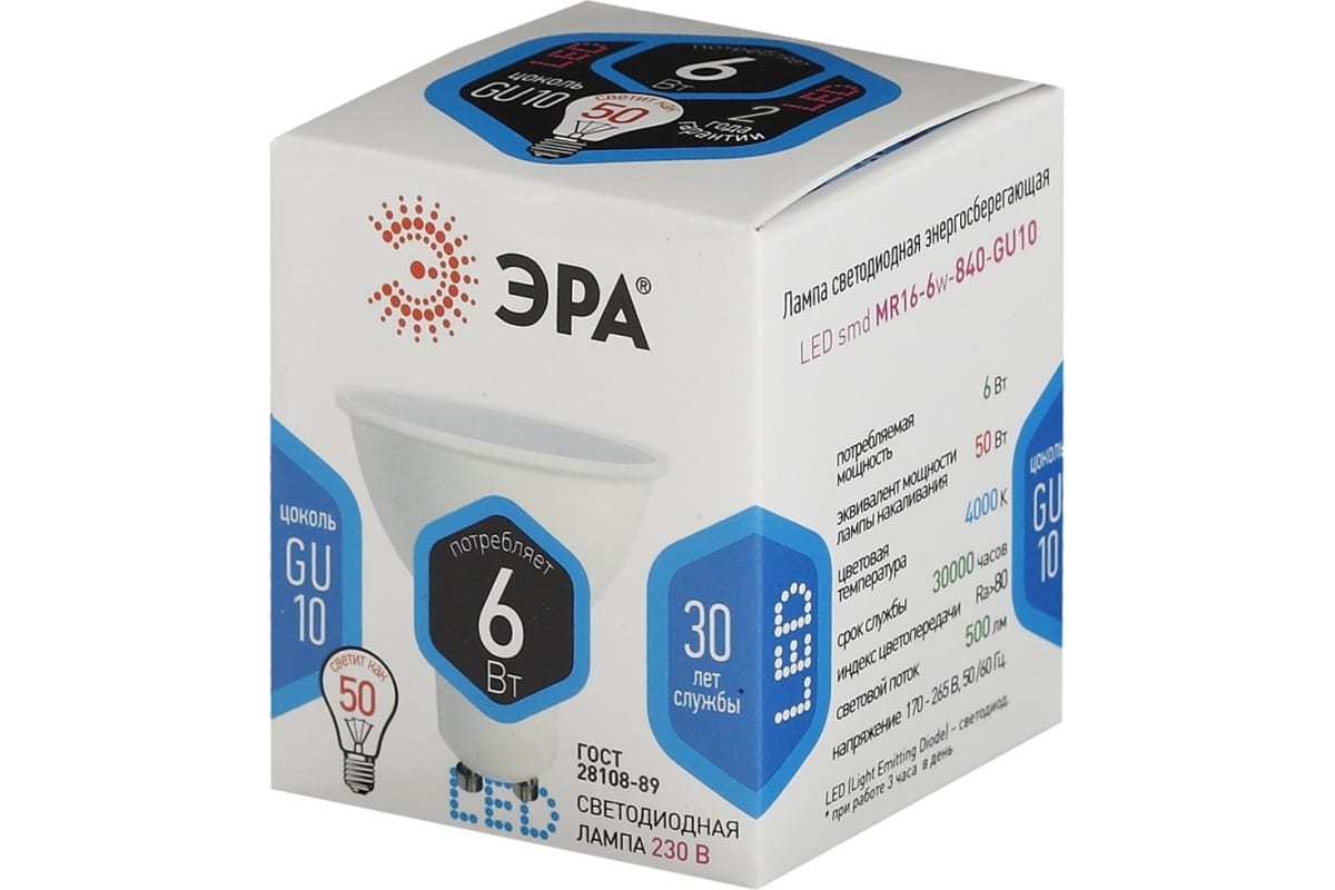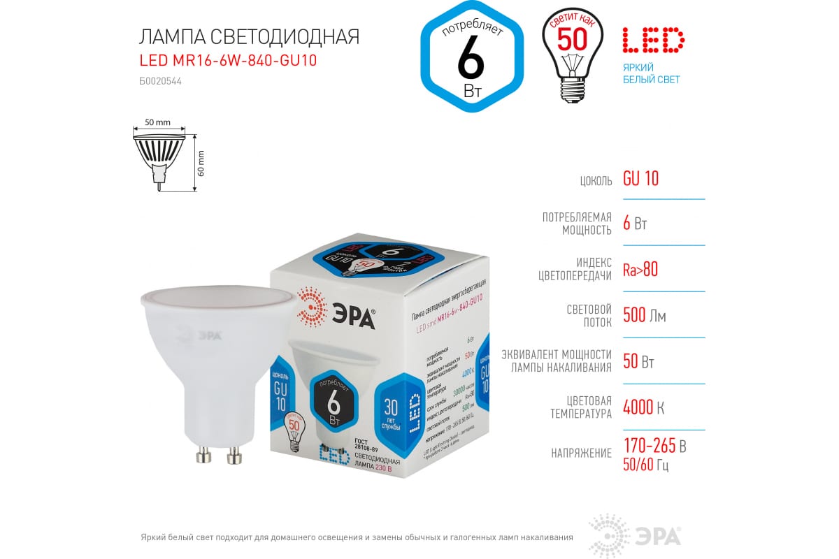 Технические характеристики ЭРА LED smd MR16-6w-840-GU10 Б0020544