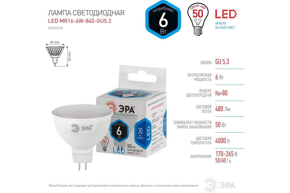 Технические характеристики ЭРА LED smd MR16-6w-840-GU5 3 Б0020545