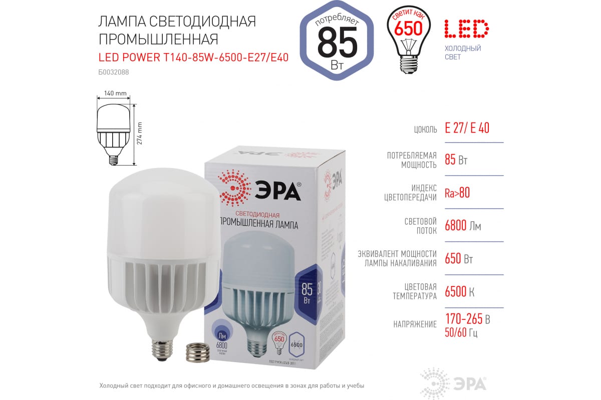 Светодиодная лампа ЭРА LED POWER T140-85W-6500-E27/E40, колокол, холодный Б0032088 для освещения производственных, торговых и подсобных помещений. Отличается высокой мощностью, грамотно продуманной системой охлаждения и широким выбором цветовых температур.
