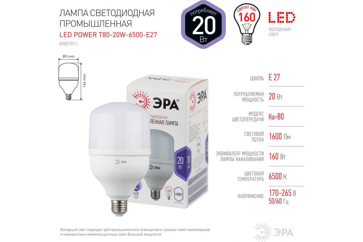 Технические характеристики ЭРА LED smd POWER 20W-6500-E27 40/800 Б0027011