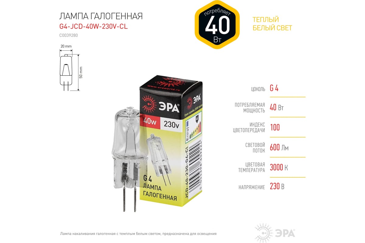 Галогенная лампа ЭРА G4-JCD-40W-230V-CL с высокой светоотдачей и устойчивостью к перепадам напряжения. Дает яркий приятный для глаз свет. Отличается хорошей цветопередачей - такое искусственное освещение не искажает естественные оттенки предметов в помещении. Под цоколь G4.
