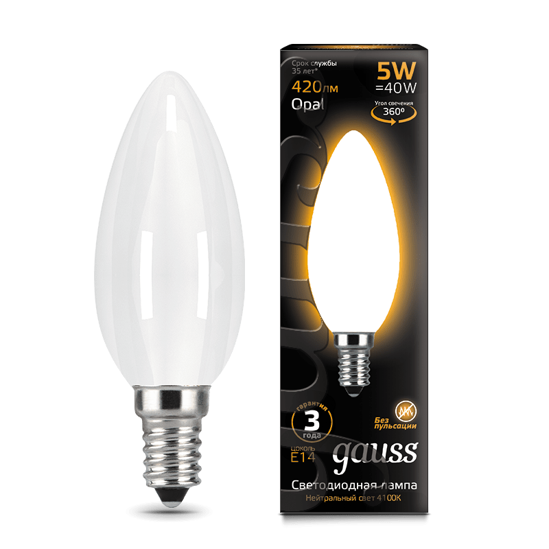 Наименование Лампа Gauss Filament Свеча 5W 420lm 2700К Е14 milky LED 1/10/50
