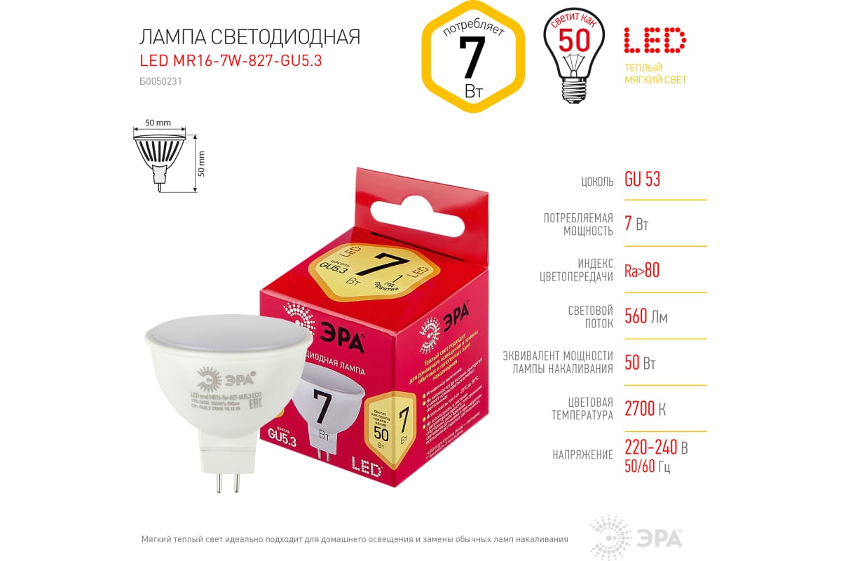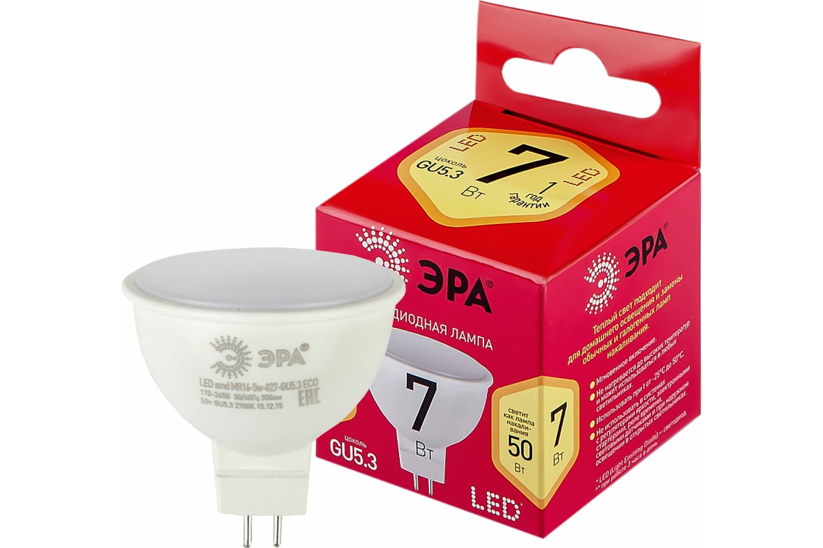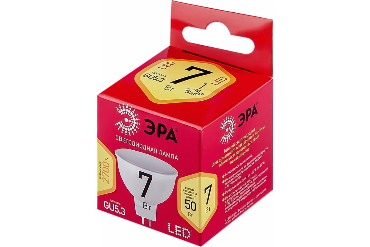 Технические характеристики ЭРА RED LINE LED MR16-7W-827-GU5.3 R GU5.3 7 Вт софит теплый белый свет Б0050231
