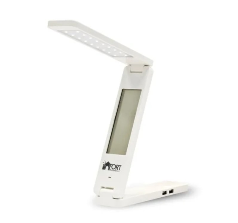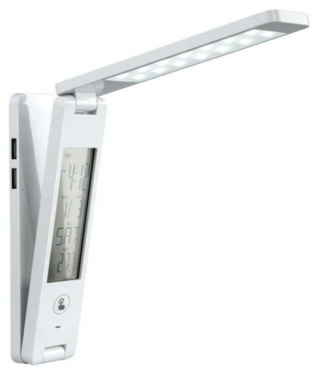 18 светодиода, регулировка угла наклона (до 180°). Встроенные функции: календарь (дата, месяц, день), часы, будильник с функцией повтора, термометр. Возможно использовать как переносной фонарь.