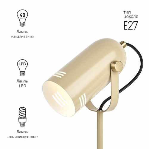 Красивый и удобный настольный светильник в стильном ретро-корпусе. Может использоваться с разными источниками света - лампой накаливания, компактной люминесцентной лампой (КЛЛ) или светодиодной (LED) лампой. Прочный металлический корпус оснащён гальванизированными элементами. Подвижный плафон позволяет регулировать направление света. В числе преимуществ для комфортного использования - устойчивость конструкции и оптимальные размеры для размещения на столе. Трендовый дизайн и актуальный бежевый цвет корпуса сделают этот светильник изюминкой интерьеров в стиле лофт и минимализм.