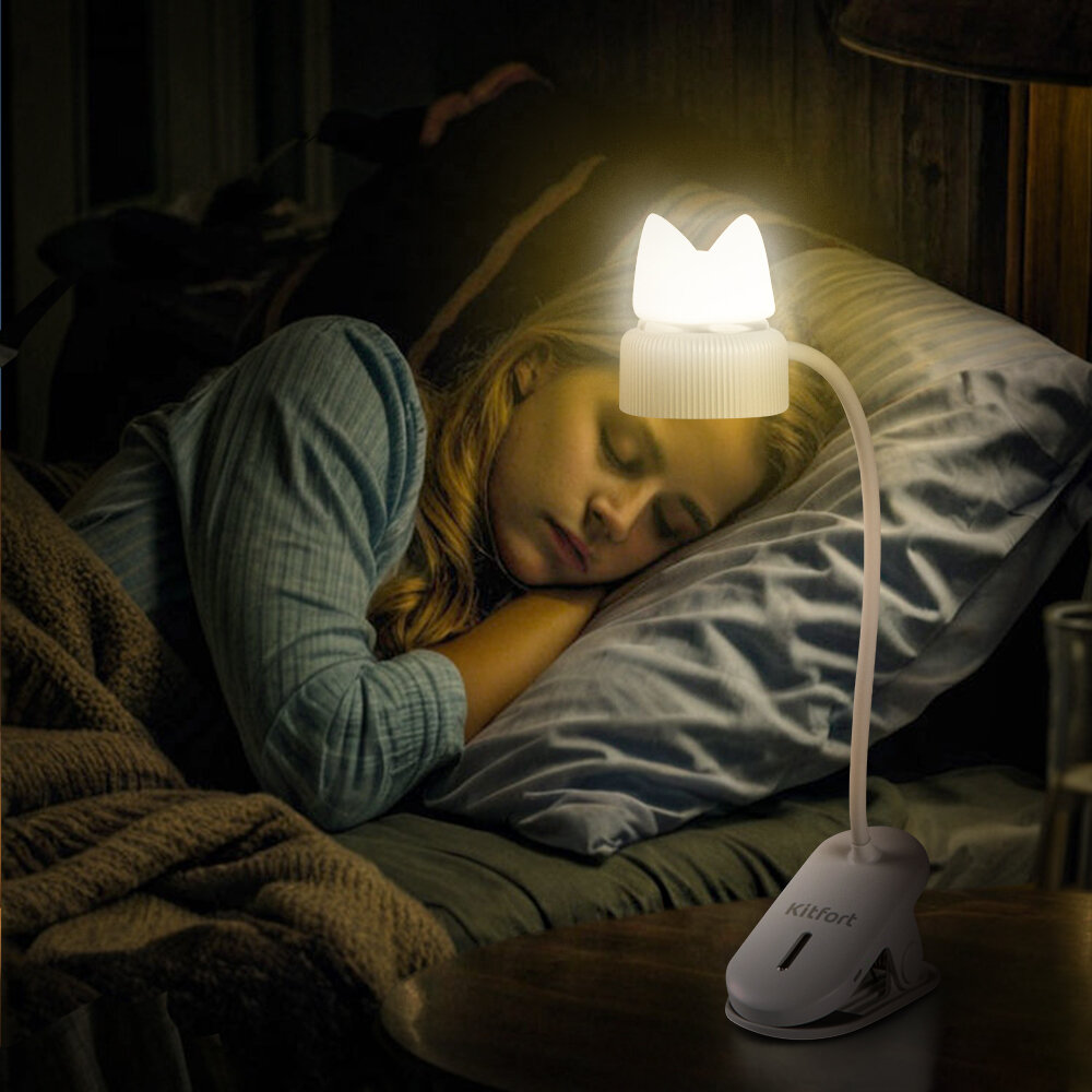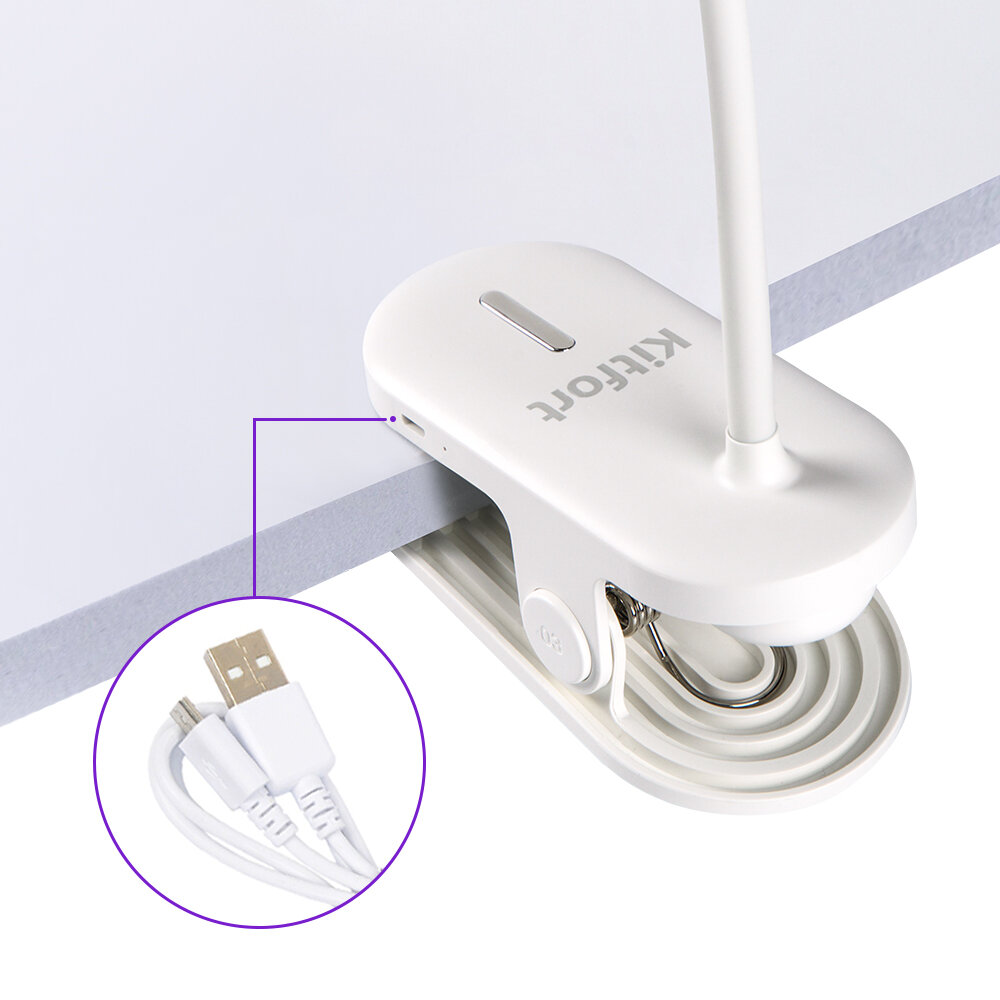 Лампу можно установить на любую плоскую поверхность или прикрепить устройство к столешнице или полке с помощью прищепки. КТ-3349 работает от аккумулятора и легко заряжается от шнура Micro-USB, который идёт в комплекте.