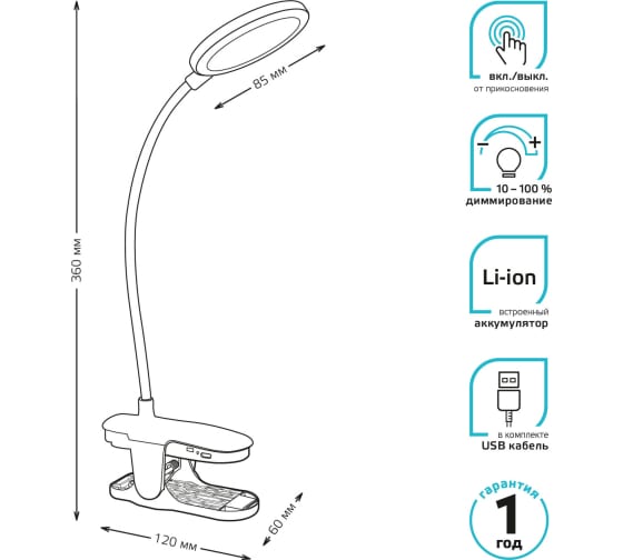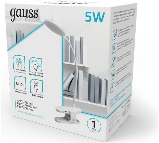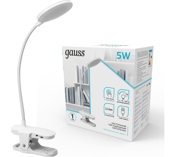 Настольная лампа от Gauss на прищепке оснащена встроенным аккумулятором. Аккумулятор Li-ion имеет большой запас емкости и легкий вес.