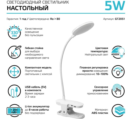 Настольный диммируемый светильник Gauss модель gtl205 5w 330lm 4000k 5v li-ion 1200ma белый led GT2051 станет незаменимым помощником. Данный источник света не требует замены батареек, он светит в течение длительного времени до следующей подзарядки, а также легко заряжается.