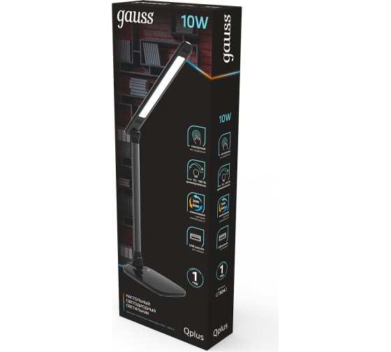 Настольный диммируемый светильник Gauss qplus модель gtl504 10w 590lm 3000-6000k 170-265v черный usb GT5042 оснащен сенсорным управлением, что позволяет управлять освещением и настраивать необходимую яркость легким прикосновением к корпусу. Обладает высокой мощностью и яркостью, а также отличной цветопередачей Ra>85.