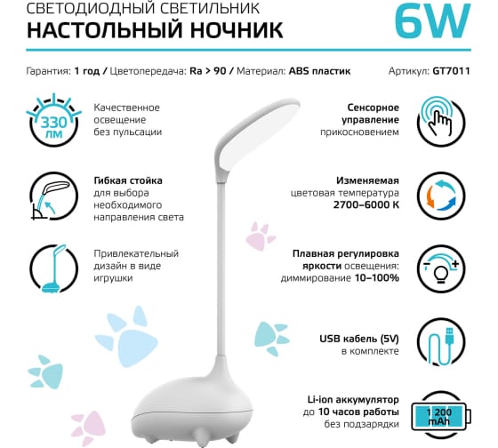 Настольный детский светильник Gauss qplus модель gtl701 6w 330lm 2700-6000k 5v li-ion 1200ma белый GT7011 выполнен из безопасного материала. Оснащен Li-ion аккумулятором, что позволяет с легкостью переносить и использовать его в удобном для ребенка месте в течение длительного времени. Зарядка аккумулятора осуществляется от шнура с USB разъемом идущего в комплекте.