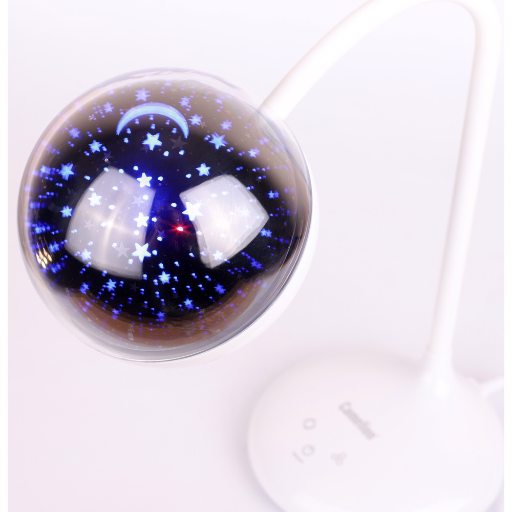Настольный светодиодный светильник Camelion KD-828 сочетает в себе функцию местного освещения рабочих мест в офисах, в домашних интерьерах , в комнатах детей и подростков и функцию RGB-проектора звездного неба. Источник света - встроенные светодиоды, мощность 6,5 Вт, макс. световой поток - 360лм, основание и плафон изготовлены из ABS-пластика, гибкая металлическая стойка в силиконовом кожухе позволяет регулировать угол наклона плафона кольцевой формы. Светильник имеет верхнюю часть плафона в виде темной полусферы, которая нужна для создания проекций звезд. При включении режима «Звездное небо» вы сможете получить маленький планетарий на стенах и потолке комнаты ,причем цвет звездного неба сможете выбрать самостоятельно. Подсветка звездного неба светодиодная, поэтому для получения проекции звезд и луны в комнате должно быть темно. Этот проектор звезд понравится всем членам семьи. Для маленьких детей – это интересный ночник для спокойного сна, для детей постарше и взрослых– красивая подсветка для мечтаний, романтики и праздников.
