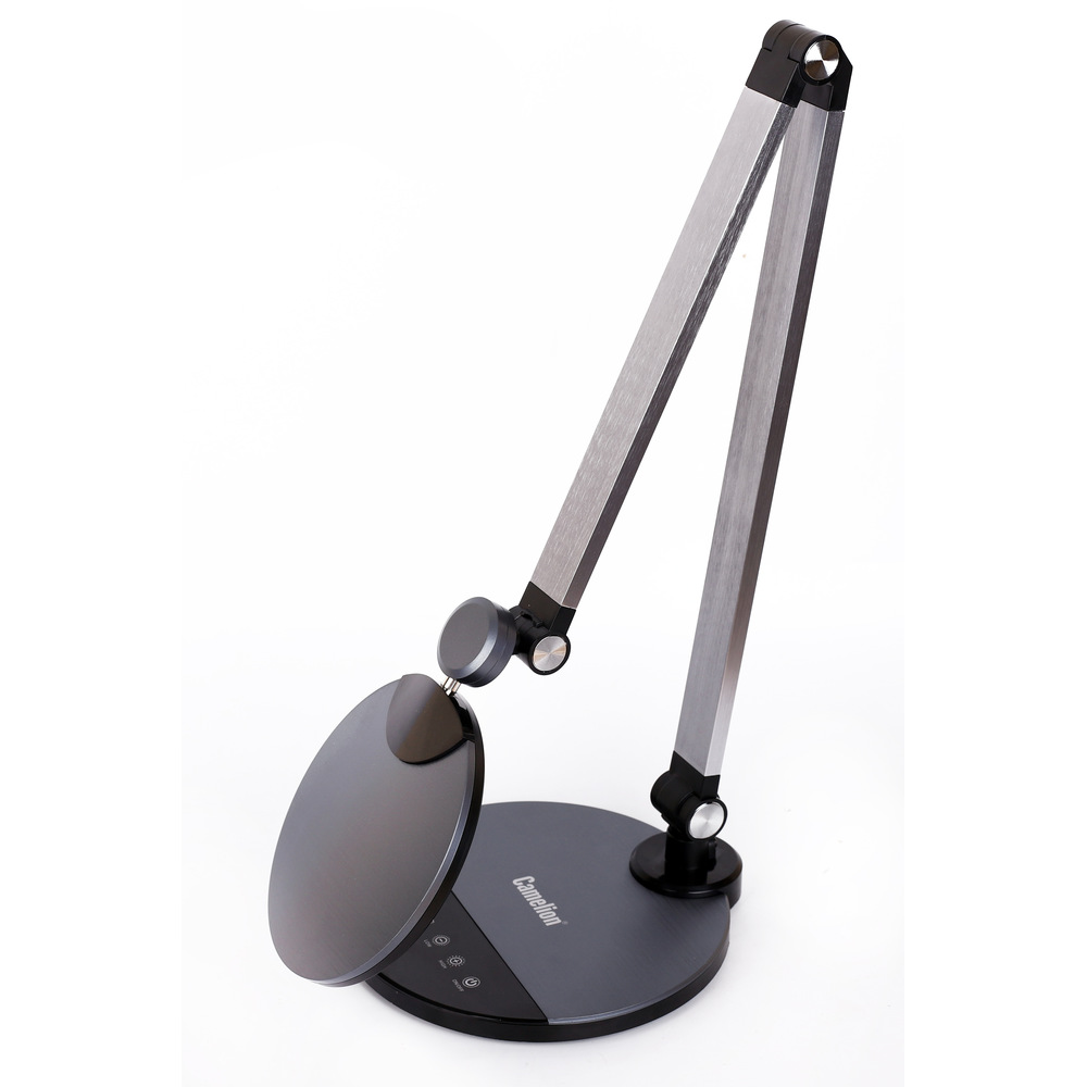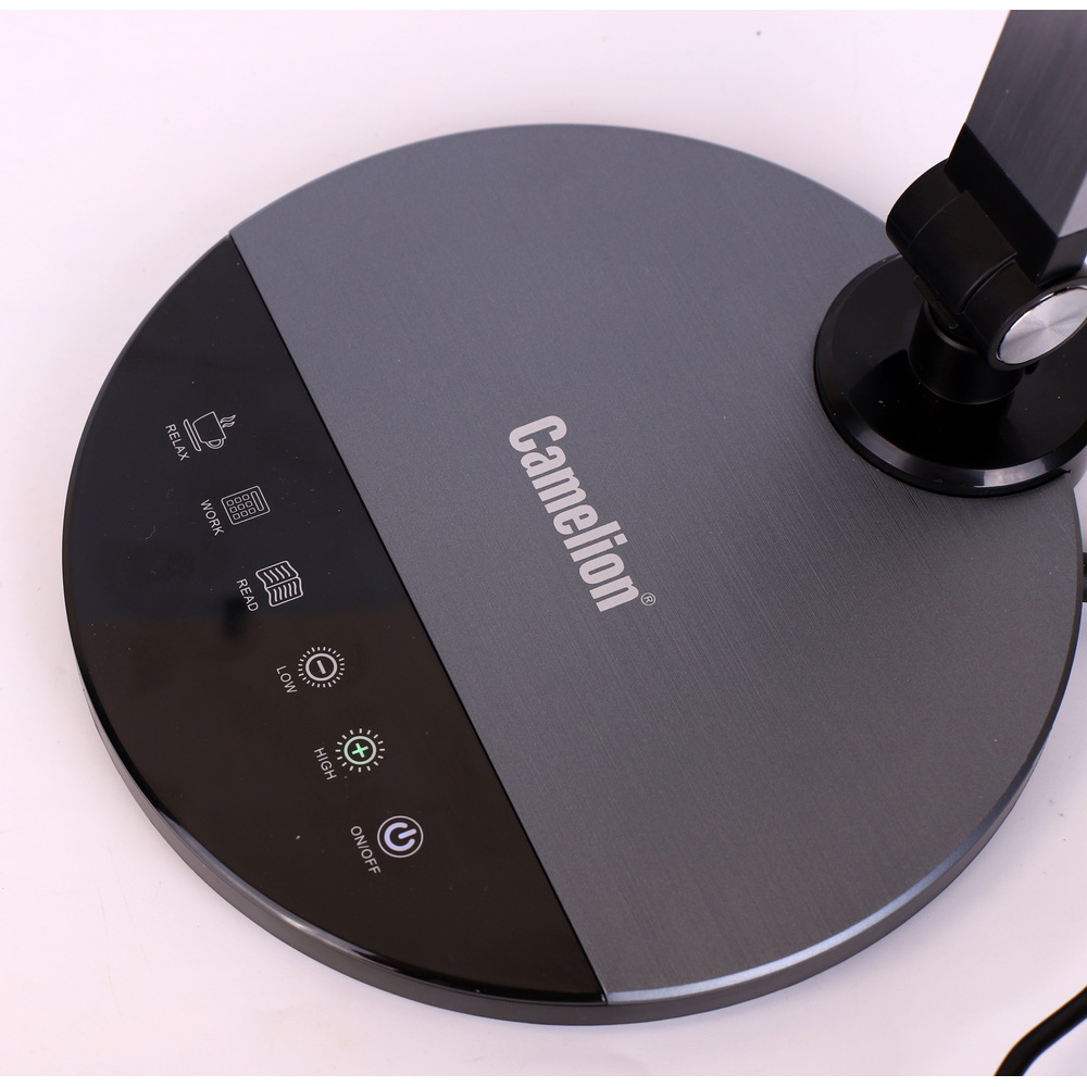Светодиодный настольный светильник Camelion KD-865 – это многофункциональный светильник качества премиум, имеет универсальное применение, может быть использован для местного освещения рабочих мест в офисах, в домашних интерьерах , в комнатах детей и подростков. Двухзвенная (400 мм и 300 мм) мощная стойка изготовлена из алюминия. Основание ( с металлическим утяжелителем внутри ) и плафон изготовлены из пластика , имеют окрашивание и финишное покрытие «под металл». Стойка светильника имеет большой диапазон регулирования в одной плоскости. Круглый плафон – имеет большой диапазон регулирования в 2-х плоскостях ( более 180 градусов). На передней панели основания размещены шесть сенсорных копок - ON/OFF ( включение /выключение, она имеет подсветку голубого цвета), три кнопки, регулирующие цветовую температуру и имеющие зеленую подсветку ,RELAX, WORK, READ(3000К-теплый, 6000К-холодный , 4000К-нейтральный свет),зеленый светодиод подсвечивает ту кнопку, чья цветовая температура установлена, и кнопки «+» и «-», регулирующие яркость света.