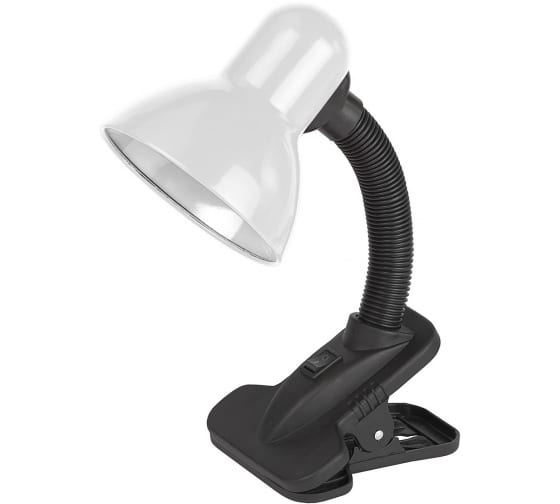 Настольный светильник ЭРА N-102-E27-40W-W белый C0041423 с гибкой стойкой, которая обеспечивает наклон и поворот плафона в любом направлении. Выключатель на прищепке. Предназначен для использования с лампой накаливания или компактной люминесцентной лампой (КЛЛ). Лампа в комплект не входит.