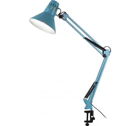 Настольный светильник ЭРА N-121-E27-40W-LBU Е27 на струбцине, голубой Б0052759 может использоваться с разными источниками света - лампой накаливания, компактной люминесцентной лампой (КЛЛ) или светодиодной. Выключатель на проводе. Высота плафона регулируется двухсекционной сгибающейся стойкой, направление света - поворотом и наклоном плафона в любом направлении.