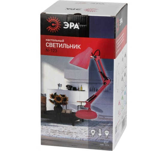 Настольный светильник ЭРА N-123-E27-40W-P трендового дизайна с классической конструкцией может использоваться с разными источниками света - лампой накаливания, компактной люминесцентной лампой (КЛЛ) или светодиодной (LED) лампой. Выключатель на проводе. Устойчивое основание. Высота плафона регулируется двухсекционной сгибающейся стойкой, направление света - поворотом и наклоном плафона в любом направлении.