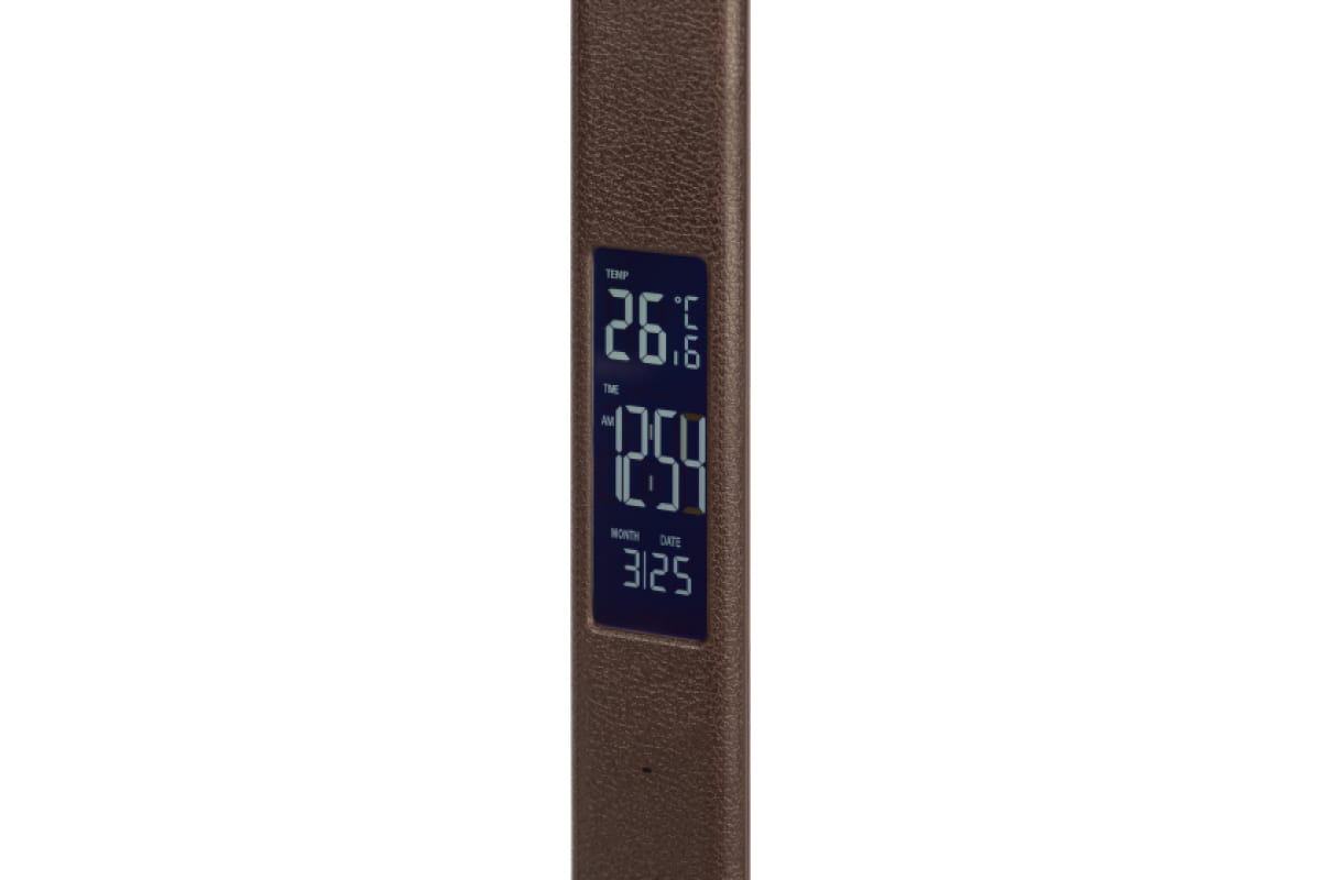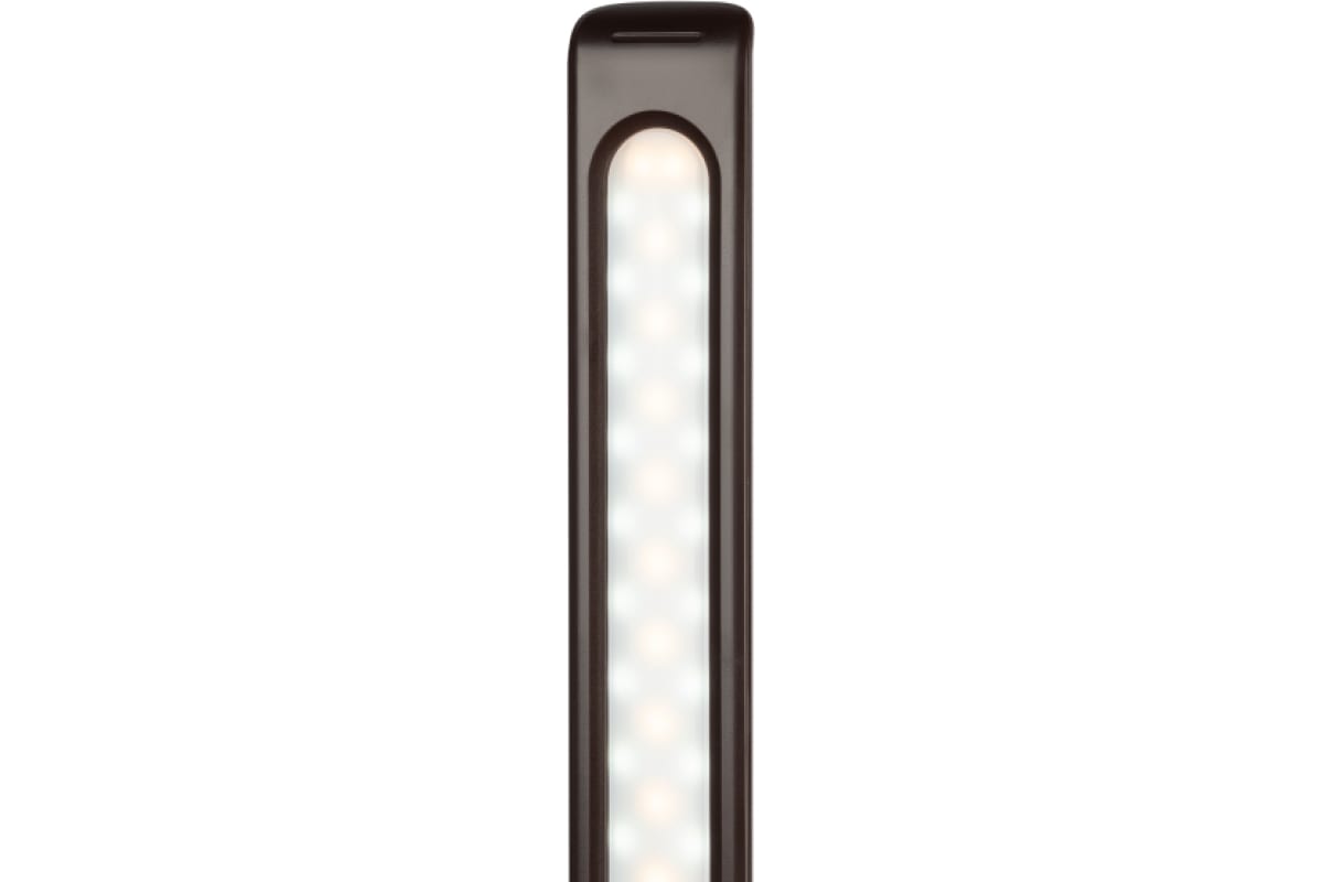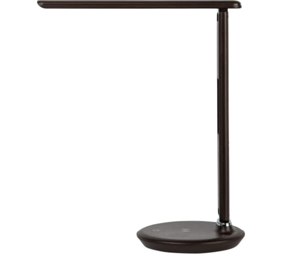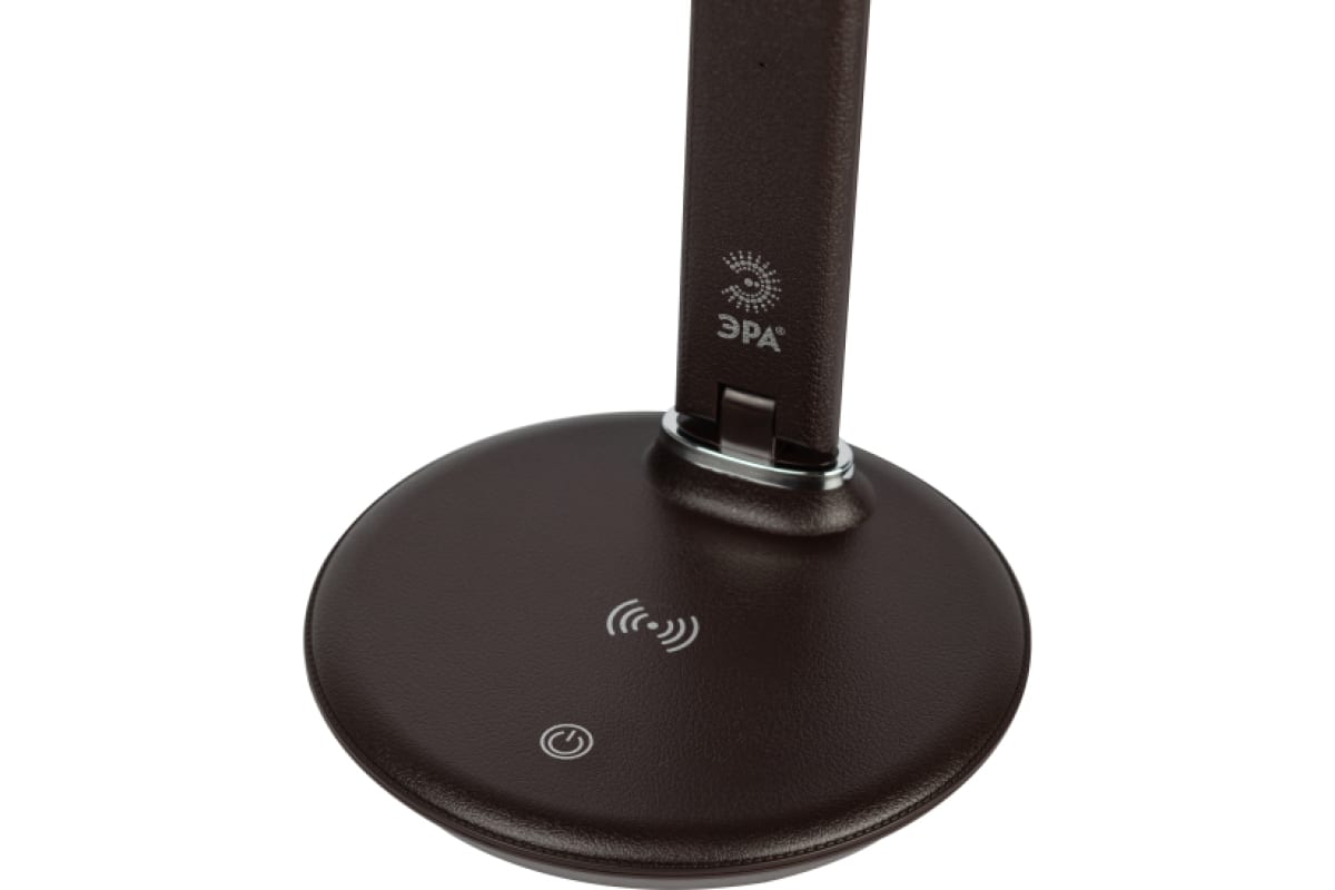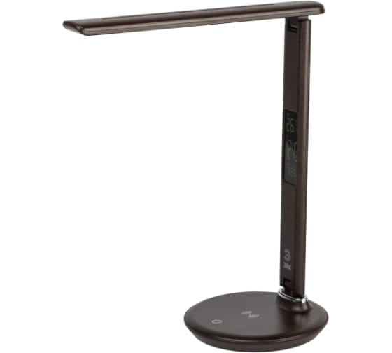 Настольный светильник ЭРА NLED-505-10W-BR со светодиодами (LED) в качестве источников света в дизайне "под кожу". Удобная складная конструкция с сенсорным управлением, возможностью выбора цветовой температуры и плавным диммером для регулировки яркости. На основании светильника расположен встроенный модуль Qi для беспроводной зарядки мобильных устройств. Просто положите телефон, поддерживающий функцию Qi на основание светильника в отмеченной зоне - светильник подзарядит его. Главное преимущество светильника - многофункциональный дисплей с функциями часов, будильника, календаря и термометра.