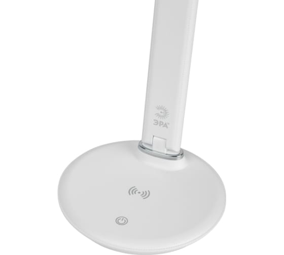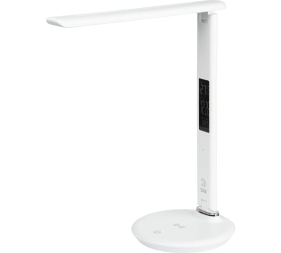 Настольный светильник ЭРА NLED-505-10W-W со светодиодами (LED) в качестве источников света в дизайне "под кожу". Удобная складная конструкция с сенсорным управлением, возможностью выбора цветовой температуры и плавным диммером для регулировки яркости. На основании светильника расположен встроенный модуль Qi для беспроводной зарядки мобильных устройств. Просто положите телефон, поддерживающий функцию Qi на основание светильника в отмеченной зоне - светильник подзарядит его. Главное преимущество светильника - многофункциональный дисплей с функциями часов, будильника, календаря и термометра.