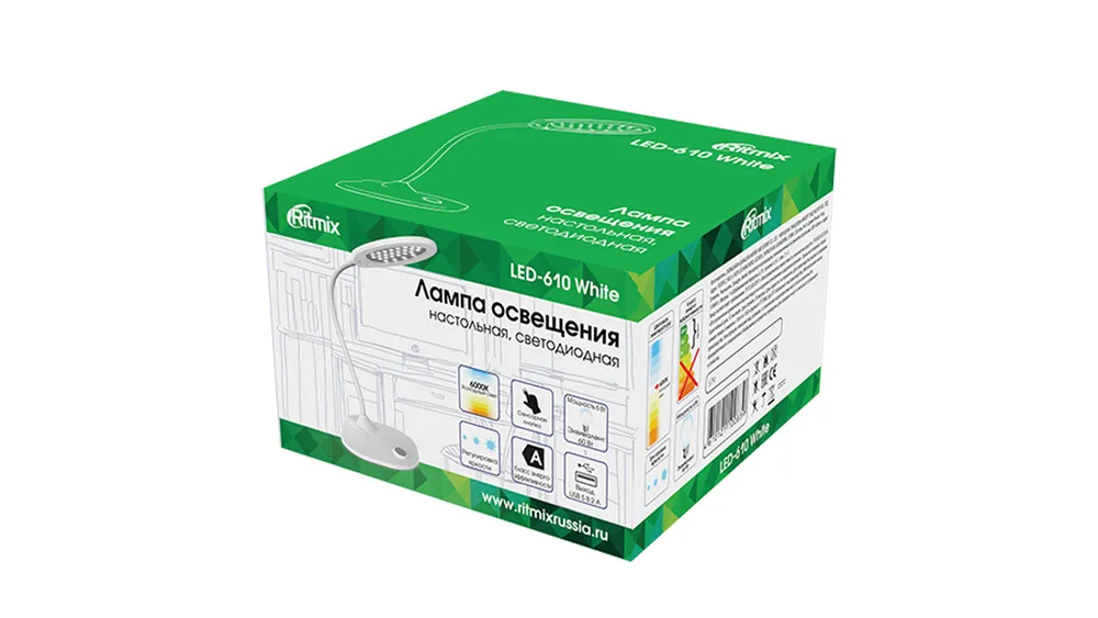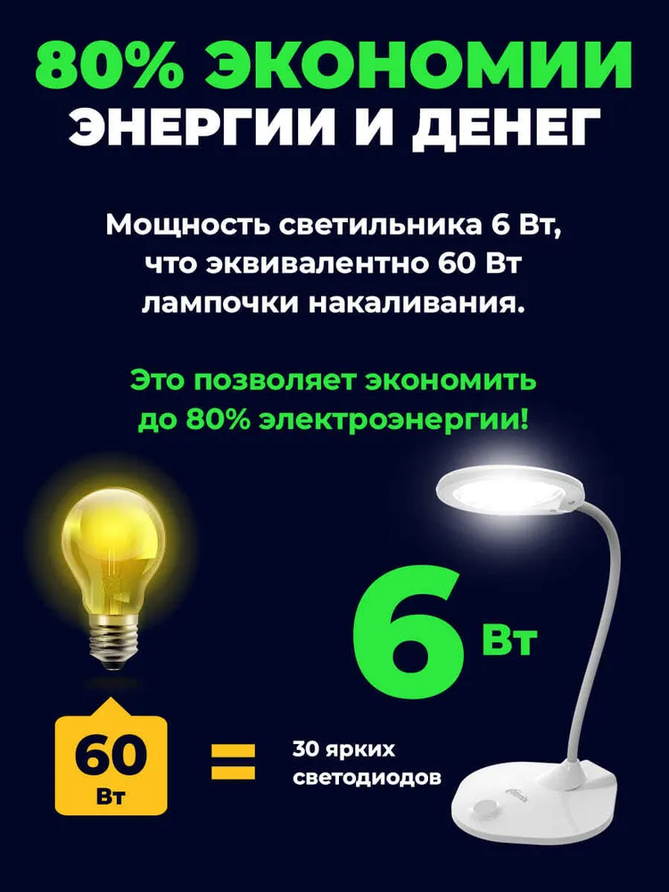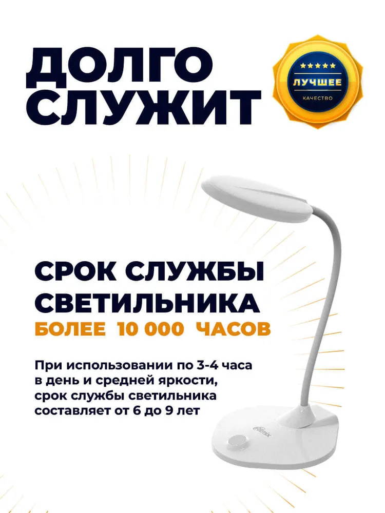 Энергосберегающая настольная лампа Ritmix LED-610 будет комфортным вариантом дополнительного освещения на рабочем месте – для учёбы, работы, хобби или игры. Имеет 30 ярких светодиодов со световым потоком 500 люмен и высоким коэффициентом цветопередачи CRI>80 Ra. Доступно удобное включение сенсорной кнопкой и выбор одного из трёх уровней яркости. Мощность 6 Вт светодиодного светильника лампы эквивалентна 60 Вт лампочки накаливания, при этом экономится до 80% электроэнергии. Класс энергоэффективности А. Срок службы светодиодов более 10 000 часов при среднем уровне яркости светильника, что при использовании по 3-4 часа ежедневно составляет от 6 до 9 лет.