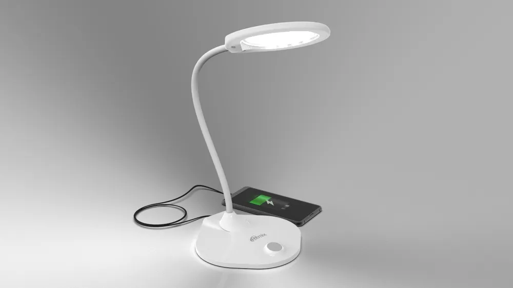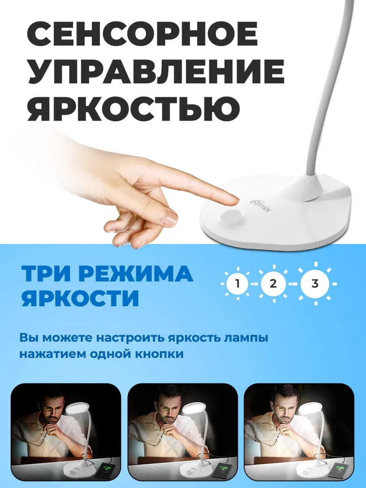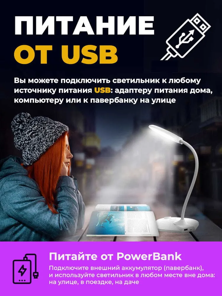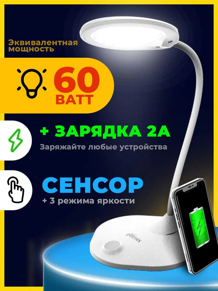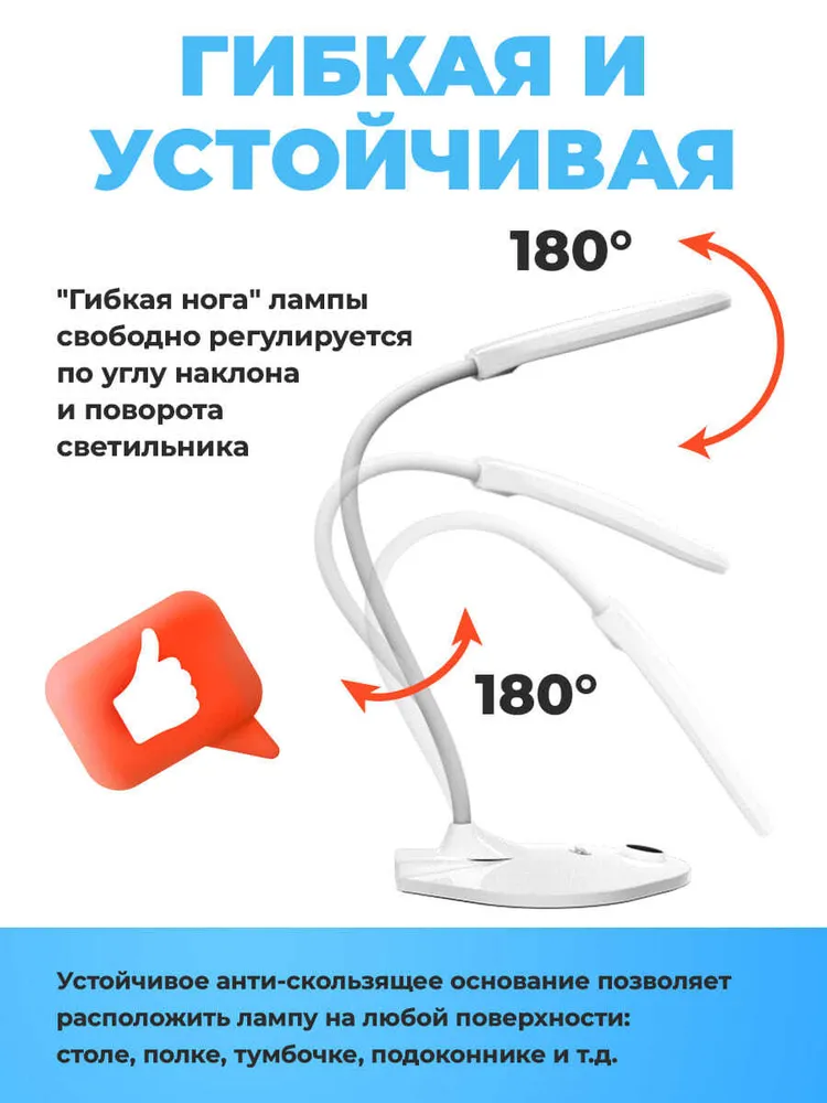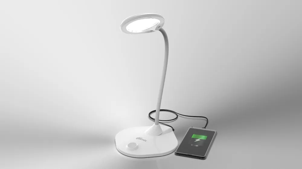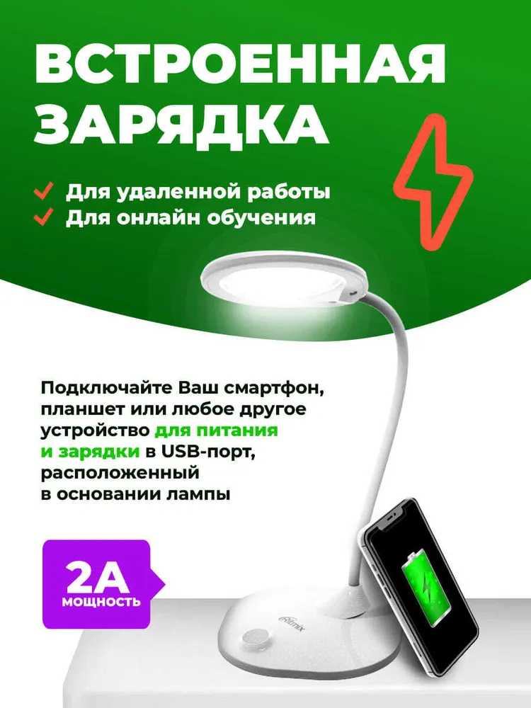 Гибкая нога: "Гибкая нога" лампы свободно регулируется по углу наклона и поворота светильника. Устойчивое нескользящее основание позволяет надёжно расположить лампу на любой горизонтальной поверхности: столе, полке, тумбочке и т.д. Благодаря выходу USB зарядки 5В 2А в основании лампы удобно подключить Ваш смартфон, планшет или любое другое устройство для питания и зарядки. Эта возможность особенно пригодится при удаленной работе или при онлайн обучении.
