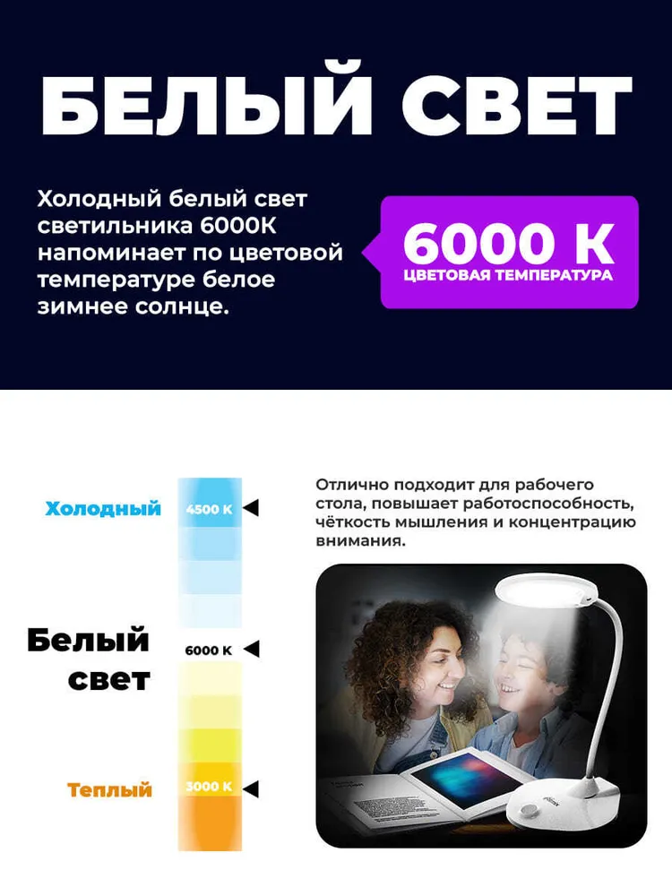 Холодный свет: Холодный белый свет 6000К напоминает по цветовой температуре белое зимнее солнце. Световой поток холодного спектра воспринимается как более яркий и интенсивный. Отлично подходит для рабочего стола, повышает работоспособность, чёткость мышления и концентрацию внимания.