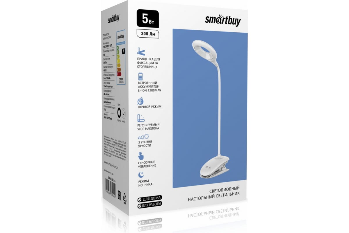 Светодиодный настольный светильник Smartbuy с прищепкой, 5 Вт, белый SBL-DL-5-cl-w имеет три уровня яркости. Световой поток: 300 Лм. Цветовая температура основного света: 4000К. Встроенный аккумулятор: Li-ion 1200мАч. Длина провода: 1,2 м, без адаптера.